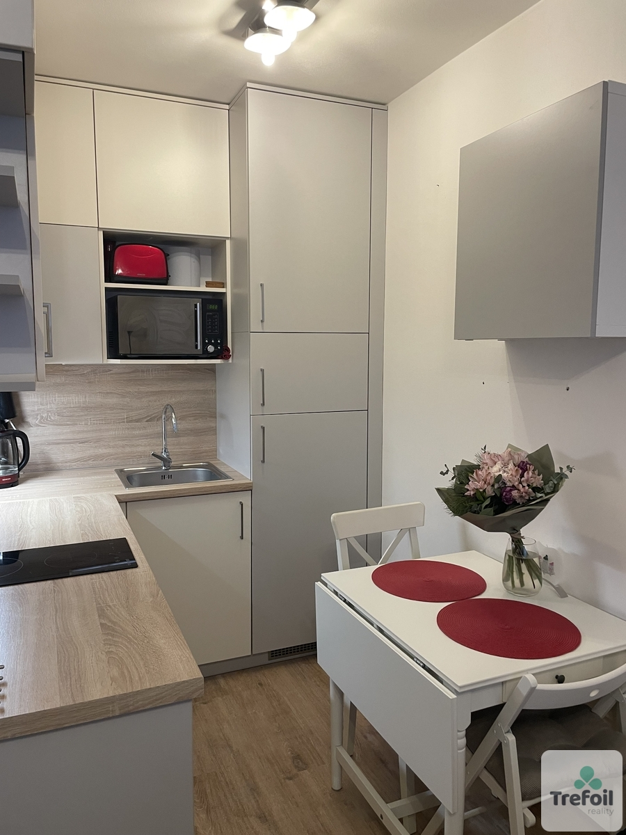 plně vybavený kuchyňský kout s vestavěnými spotřebiči (lednice, myčka nádobí, sporák, mikrovlnná trouba)