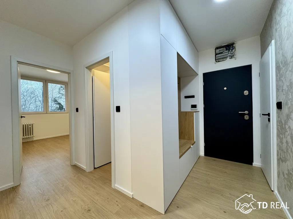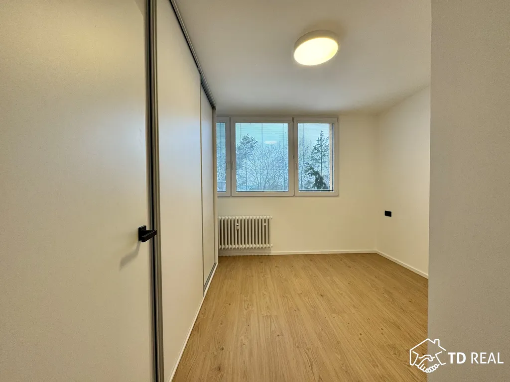 Dispozice: vstupní předsíň se vstupy koupelny, toaleta je zvlášť, vstup do obývacího pokoje (18m²) na který navazuje kuchyně. Dále je k dispozici ložnice (13m²), prostorná šatna a dětský pokoj (18m²). Z dětského pokoje je vstup na lodžii. Byt prošel aktuálně nákladnou rekonstrukcí.