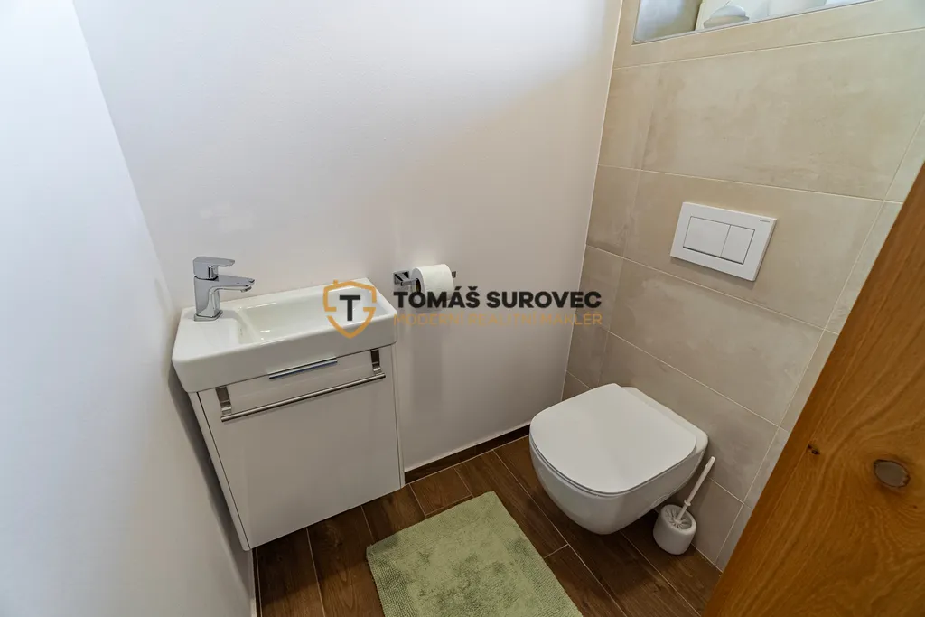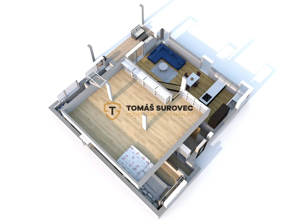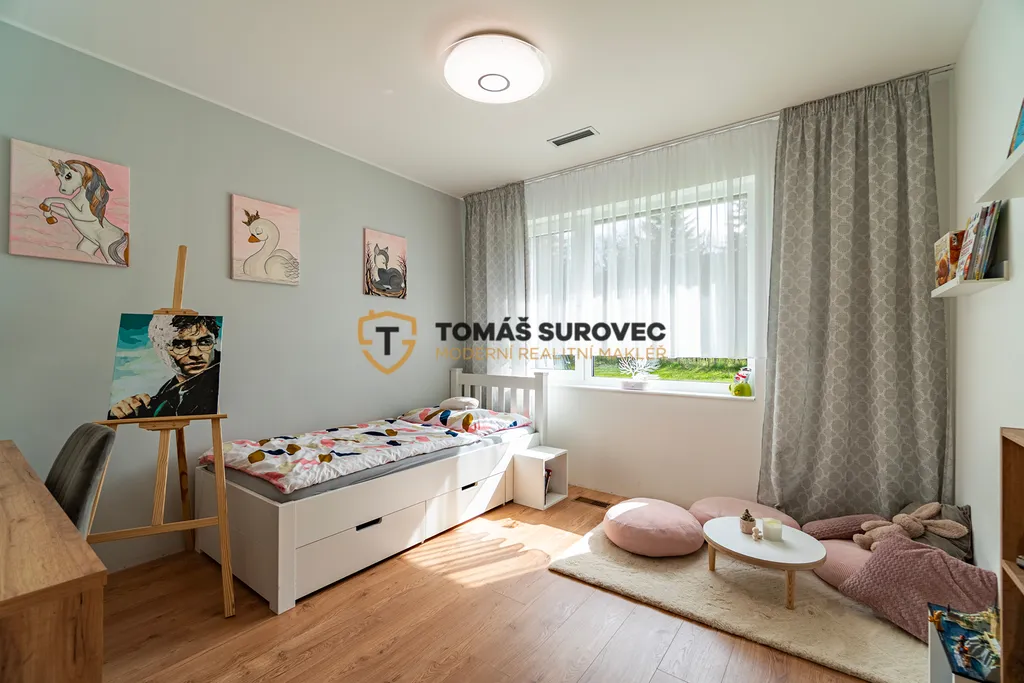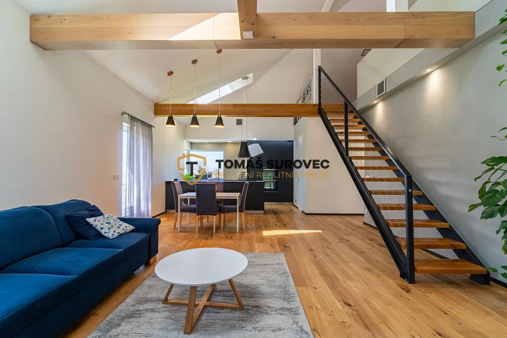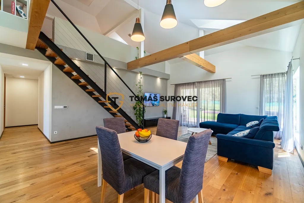 Srdcem domu je prostorný obývací pokoj, který plynule navazuje na moderně vybavenou kuchyň s vestavěnými spotřebiči a praktickou spíží. Nad obývákem vznikla galerie, ideální pro pracovnu, relaxační kout nebo hernu. Každý detail zde byl promyšlen tak, aby spojoval funkčnost a krásu.