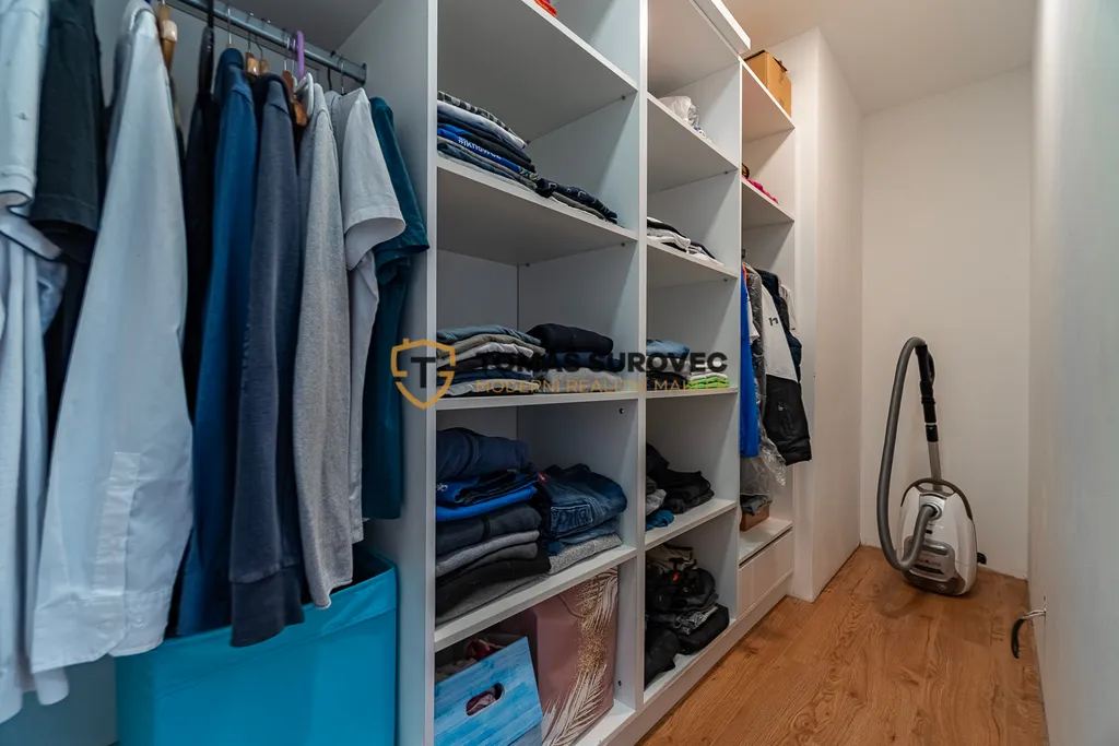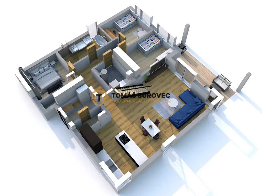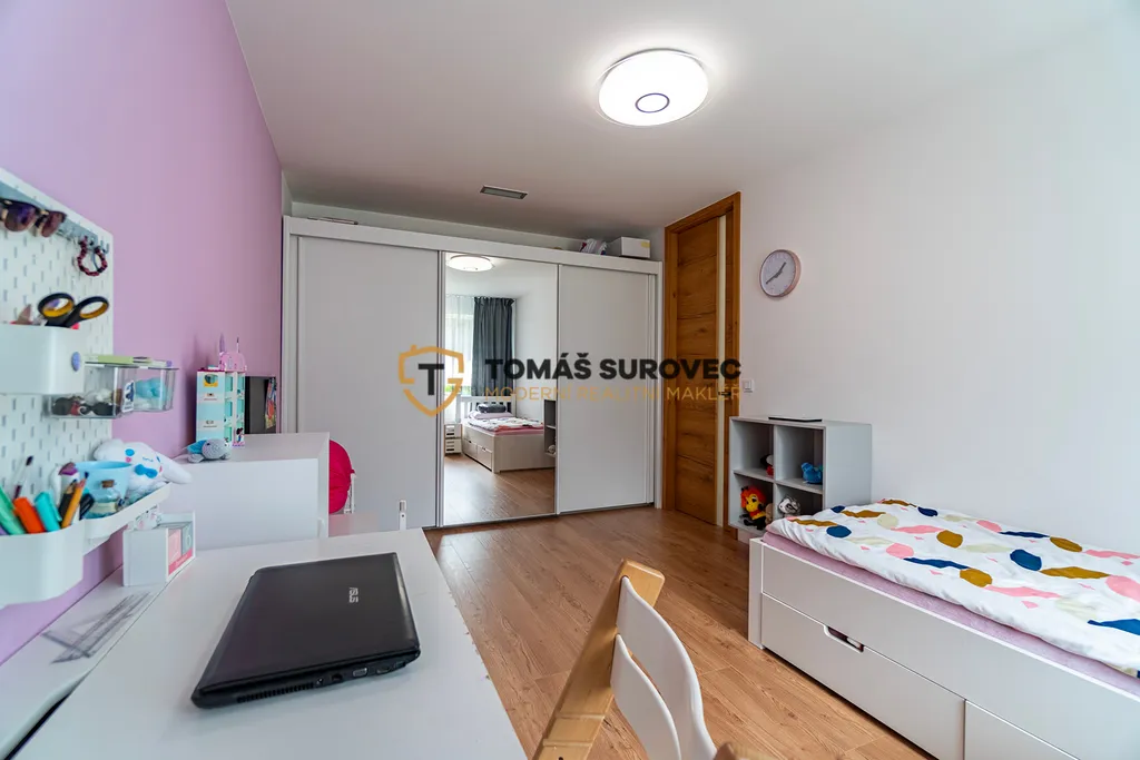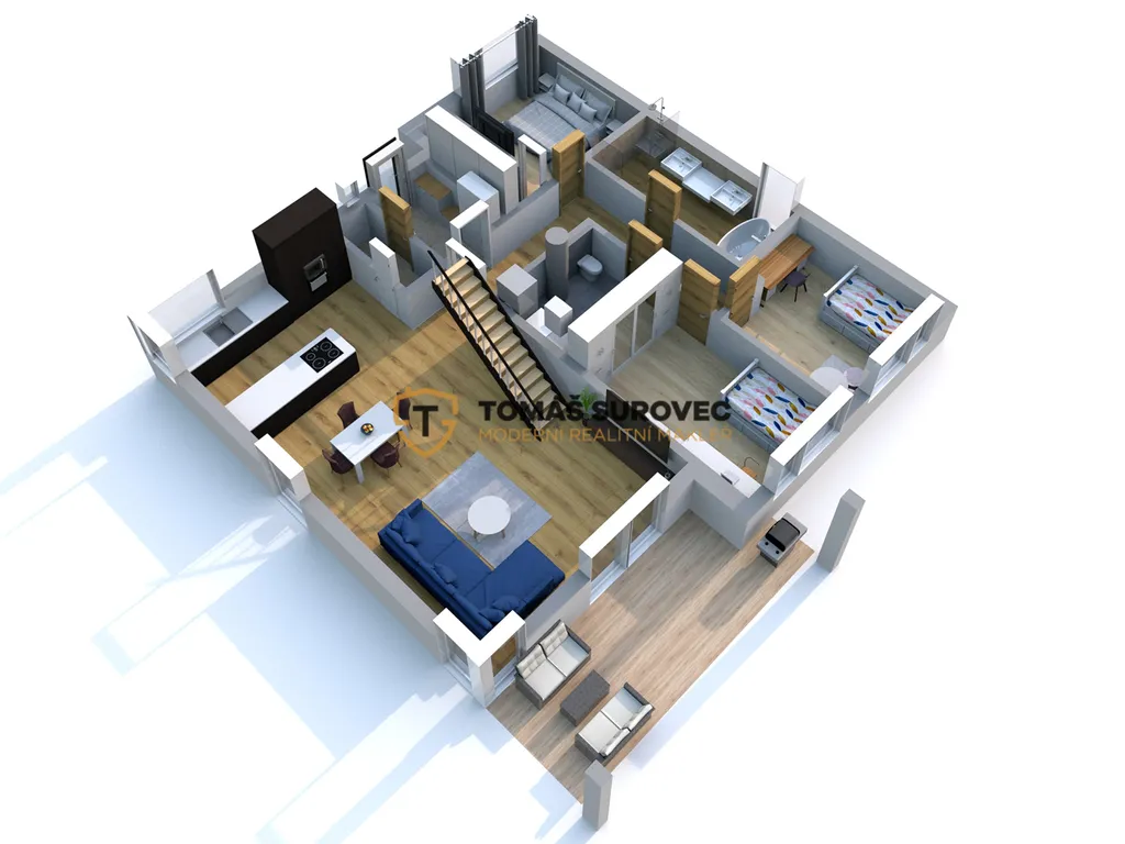 Srdcem domu je prostorný obývací pokoj, který plynule navazuje na moderně vybavenou kuchyň s vestavěnými spotřebiči a praktickou spíží. Nad obývákem vznikla galerie, ideální pro pracovnu, relaxační kout nebo hernu. Každý detail zde byl promyšlen tak, aby spojoval funkčnost a krásu.