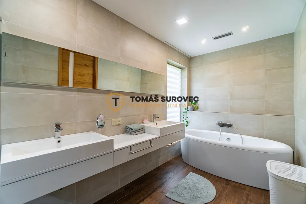 Soukromou část domu tvoří ložnice s vlastní šatnou a dva neprůchozí dětské pokoje. K dispozici je samostatné WC a luxusní koupelna s volně stojící vanou, sprchovým koutem a dvěma umyvadly.
