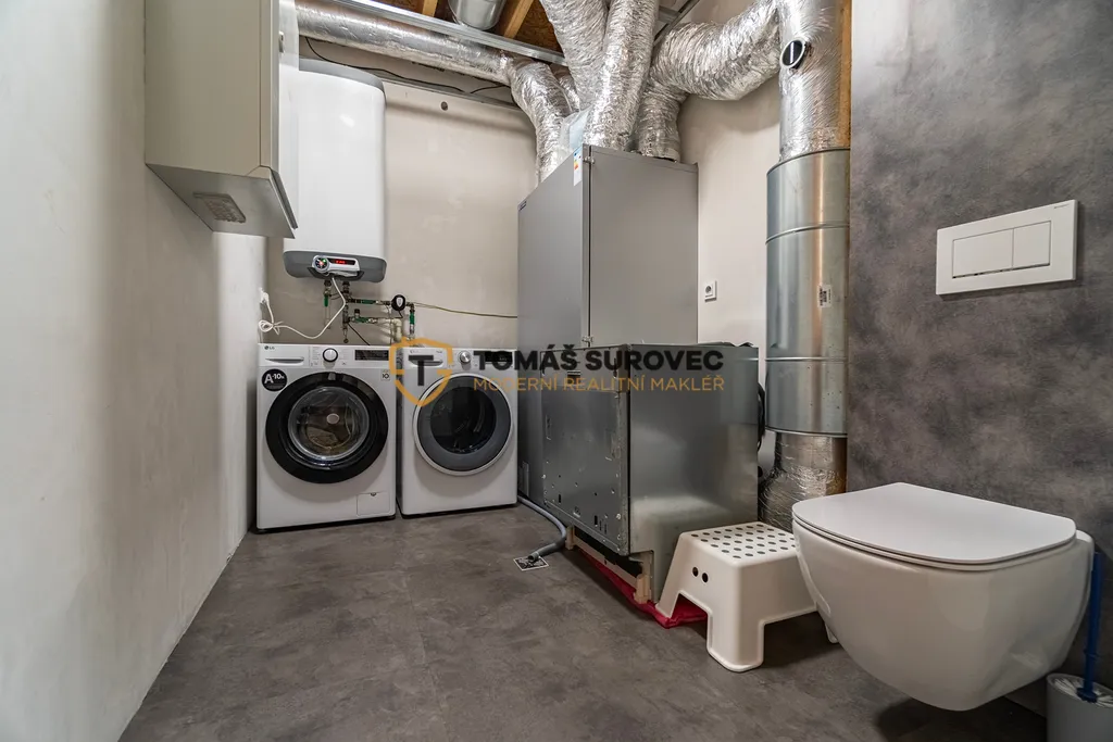Technická místnost chytře ukrývá pračku, sušičku, rekuperační jednotku i další toaletu. Všechny technologie jsou maximálně efektivní a šetrné k provozním nákladům.