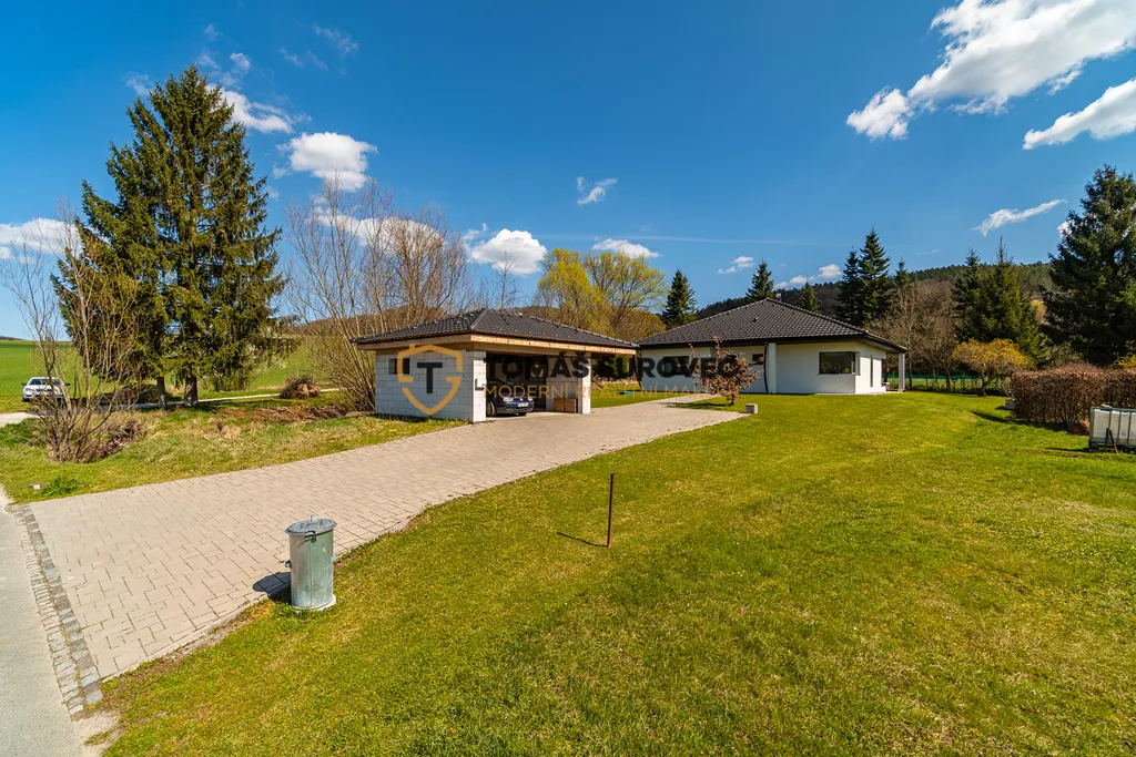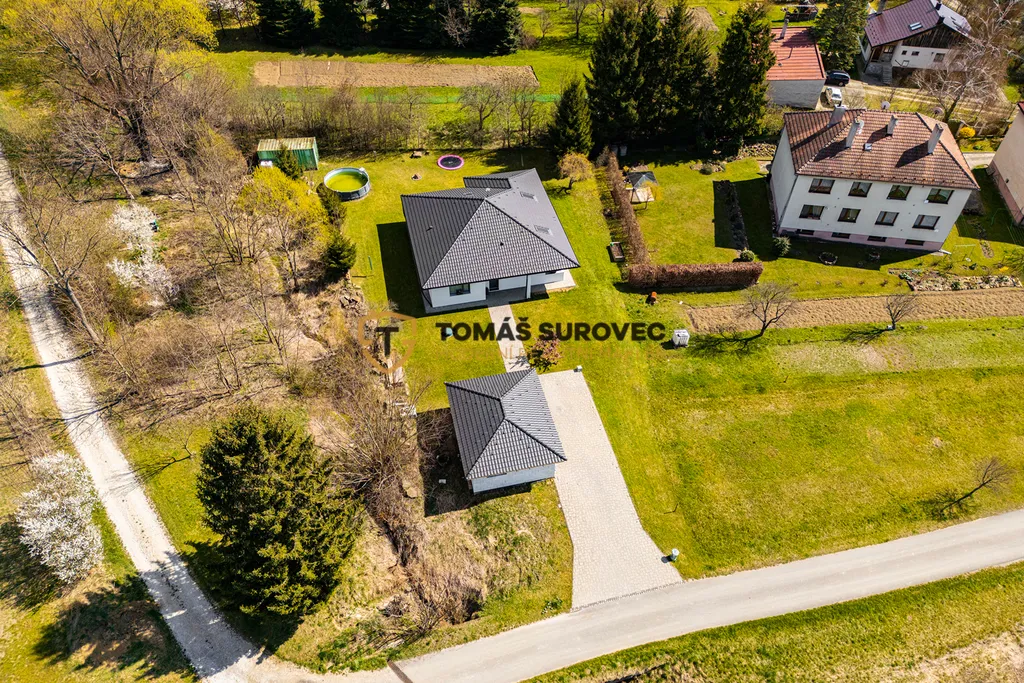 Exteriér domu láká na terasu ideální pro letní večery a před domem vás čeká garáž připravená k dokončení dle vašich přání. Velkorysý pozemek o rozloze více než 1 800 m² nabízí neomezené možnosti – ať už sníte o zahradě, hřišti, skleníku nebo vířivce.