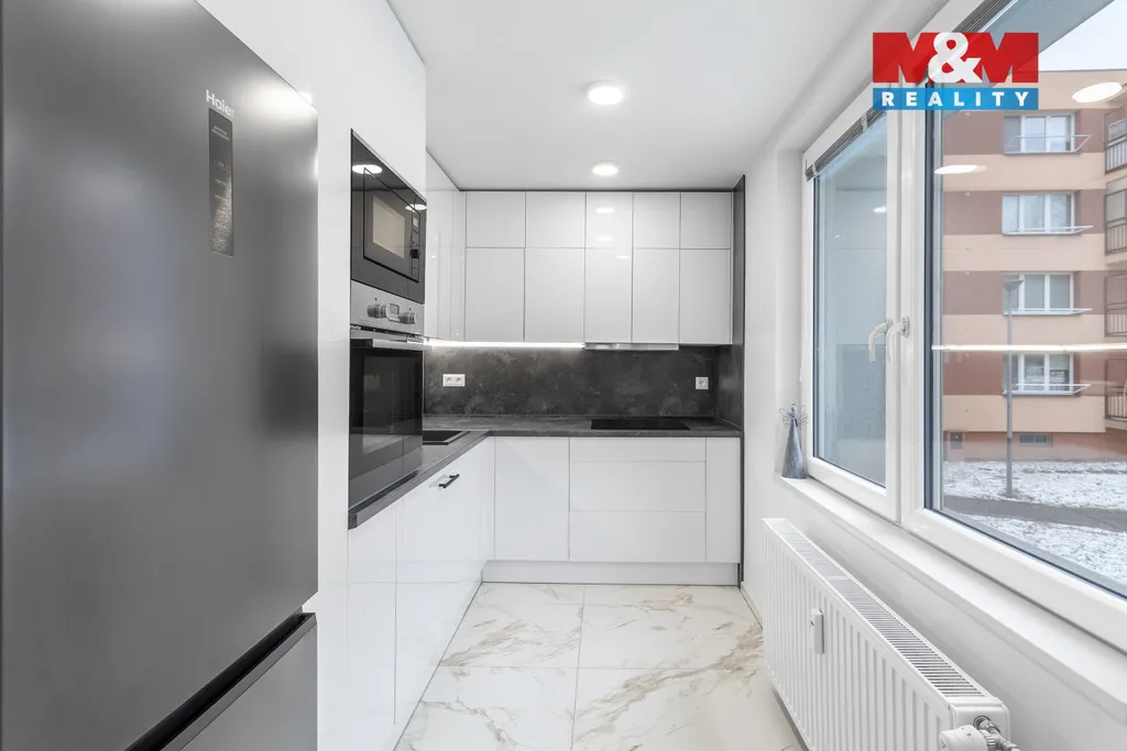 Exkluzivně nabízíme k prodeji byt 2+1 v osobním vlastnictví, po nadstandardní rekonstrukci, o podlahové ploše 62 m2. Nachází se ve zvýšeném přízemí zrevitalizovaného nízkopodlažního domu v klidné části ulice Břustkovy, v Ostravě Výškovicích. Byt disponuje prostorným obývacím pokojem s jídelním stolem a vstupem do kuchyně, velkou ložnicí, umožňující umístit kromě vestavěné skříně i pracovní kout, předsíní s další vestavěnou skříní a také koupelnou s vanou, s dvojicí umyvadel a vestavným WC. Rekonstrukce bytu v moderním designu zahrnovala novou elektroinstalaci, stropní pohledy, vydláždění podlah italskou luxusní dlažbou, dvě vestavěné skříně a taktéž kuchyňskou linku v bílém lesku a vestavěnými spotřebiči. Bonusem je skutečnost, že vybavení bytu včetně kvalitní sedací soupravy, postele, jídelního stolu s židlemi, veškerých televizí i efektního elektrického krbu je v ceně nemovitosti. Výhodou je také blízkost zastávek MHD, škol, školek, obchodů i možnost procházek v Bělském Lese.