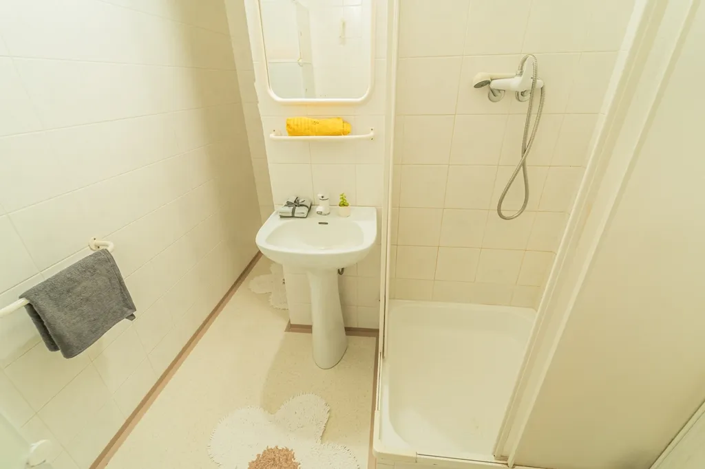 Dispozice bytu zahrnuje vstupní předsíň s velkou šatní skříní, koupelnu se sprchovým koutem a WC a prostorný pokoj s kuchyňskou linkou a dostatkem místa na spací kout i obývací část. Byt má zděné jádro a paní nájemnice, která v bytě dlouhodobě pobývá, se o něj velmi pečlivě stará.