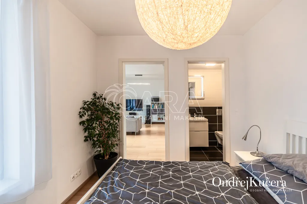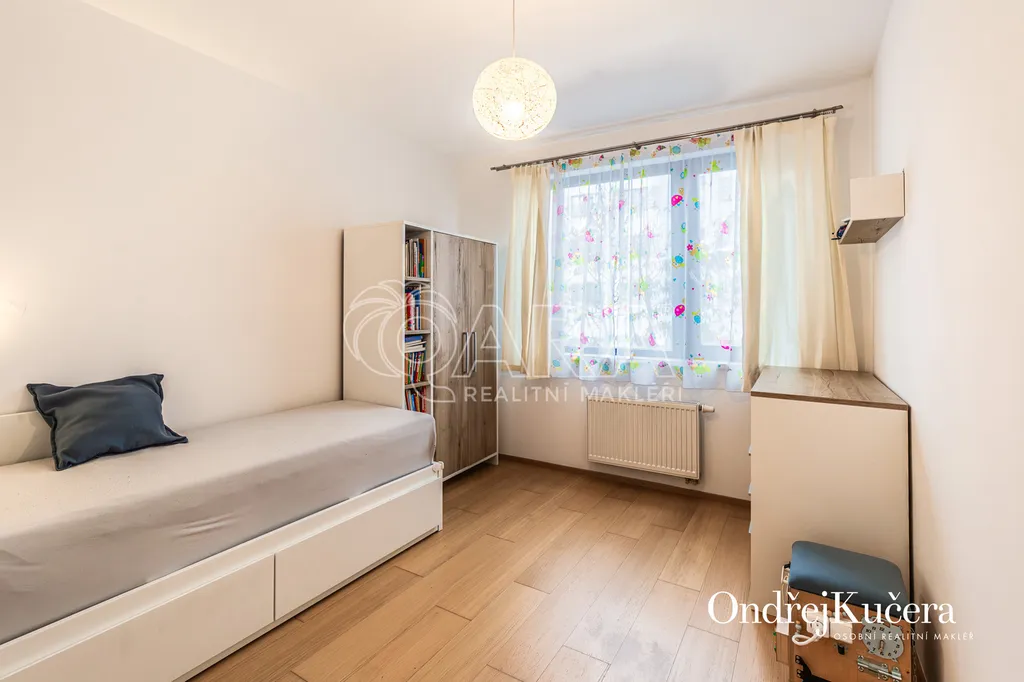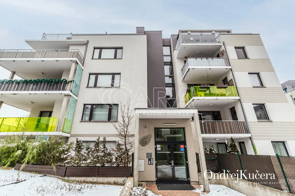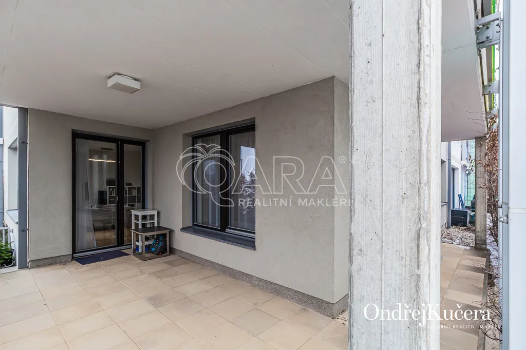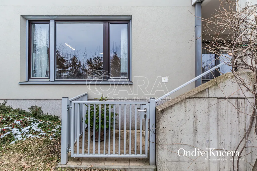 Tento byt o ploše 100 m2 a s celkovou výměrou 188 m2 včetně příslušenství (bez sklepa a garážových stání) se nachází ve zvýšeném přízemí nízkoenergetické novostavby z roku 2017. Je vybavený klimatizací pro komfortní bydlení. Dominantou bytu je světlý obývací pokoj s plně vybaveným kuchyňským koutem a prakticky umístěným ostrůvkem na práci i vaření. Na něj navazuje hlavní ložnice, která má vlastní koupelnu s toaletou a sprchovým koutem. Další dva samostatné pokoje jsou v zadní části bytu a lze je využít jako dětské pokoje, pracovnu nebo pokoj pro hosty. Hlavní terasa obklopuje celý byt a je přístupná z několika pokojů. Z terasy je dále vstup na soukromou zahradu. Díky velkým oknům a přímému vstupu na terasu a zahradu je prostor krásně vzdušný a světlý. Po vstupu do bytu vás přivítá prostorná předsíň s místem pro vestavěné skříně. Hned u vstupu je prakticky umístěna druhá samostatná toaleta. Další koupelna s vanou je pak v zadní části bytu, kde se nachází i prostorná komora. K bytu také náleží prostorný sklep 4,4 m2 a dvě parkovací stání v suterénu domu s kamerovým systémem.