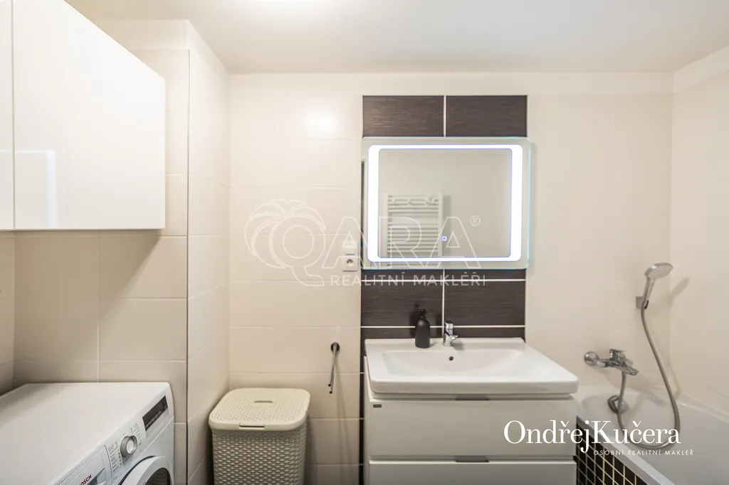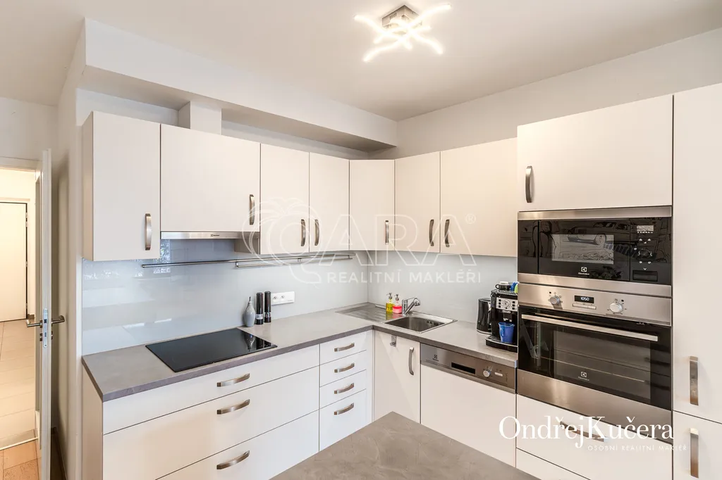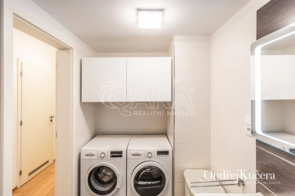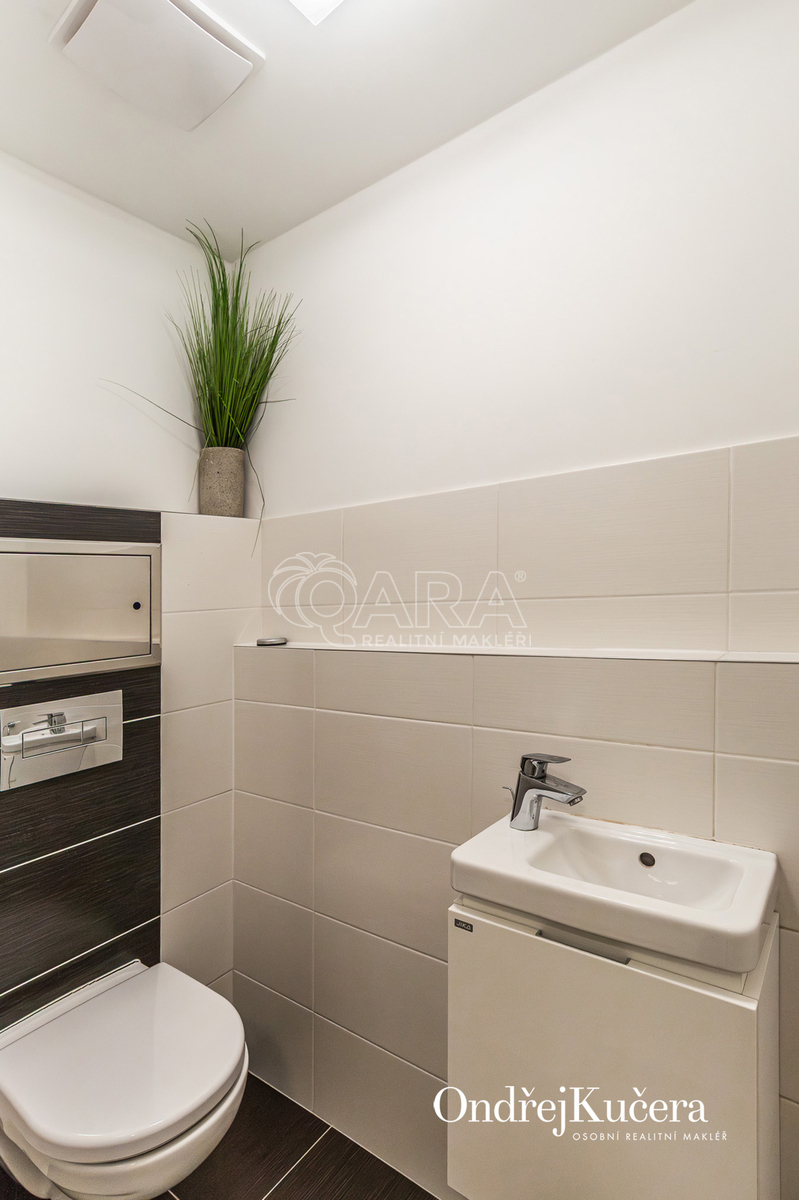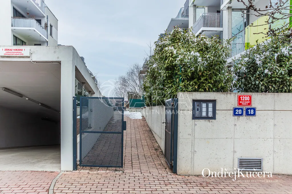 Tento byt o ploše 100 m2 a s celkovou výměrou 188 m2 včetně příslušenství (bez sklepa a garážových stání) se nachází ve zvýšeném přízemí nízkoenergetické novostavby z roku 2017. Je vybavený klimatizací pro komfortní bydlení. Dominantou bytu je světlý obývací pokoj s plně vybaveným kuchyňským koutem a prakticky umístěným ostrůvkem na práci i vaření. Na něj navazuje hlavní ložnice, která má vlastní koupelnu s toaletou a sprchovým koutem. Další dva samostatné pokoje jsou v zadní části bytu a lze je využít jako dětské pokoje, pracovnu nebo pokoj pro hosty. Hlavní terasa obklopuje celý byt a je přístupná z několika pokojů. Z terasy je dále vstup na soukromou zahradu. Díky velkým oknům a přímému vstupu na terasu a zahradu je prostor krásně vzdušný a světlý. Po vstupu do bytu vás přivítá prostorná předsíň s místem pro vestavěné skříně. Hned u vstupu je prakticky umístěna druhá samostatná toaleta. Další koupelna s vanou je pak v zadní části bytu, kde se nachází i prostorná komora. K bytu také náleží prostorný sklep 4,4 m2 a dvě parkovací stání v suterénu domu s kamerovým systémem.