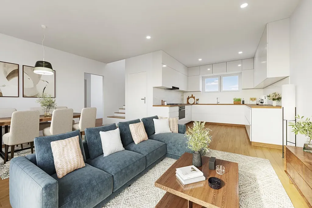 V 1. nadzemní podlaží se nachází samostatná toaleta, technická místnost (vnitřní jednotka TČ, pračka, sušička) a obývací pokoj s kuchyňským koutem (41,9 m2, jihovýchod), který poskytuje přímý vstup na terasu.