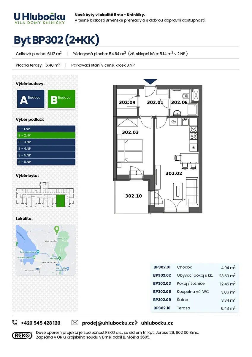 Nabízíme k prodeji byt o dispozici 2+kk s celkovou podlahovou plochou 49,50 m², který disponuje šatnou a jednou terasou o celkové výměře 6,48 m². Byt se nachází v 2.NP moderního terasového viladomu s výtahem v projektu U Hlubočku, dům B, v atraktivní lokalitě Brno–Kníničky. Orientace bytu je na východ s krásným výhledem na Mniší horu. V případě zájmu lze dokoupit parkovací stání.