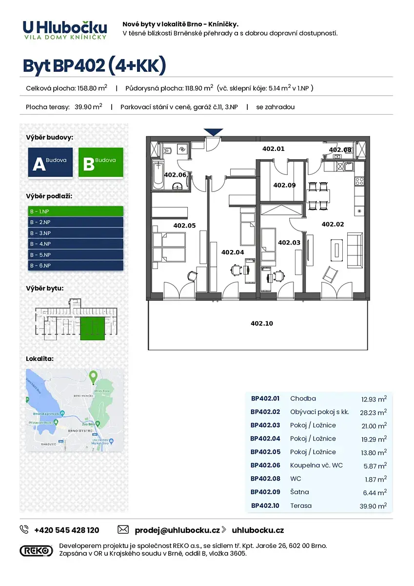 Nabízíme k prodeji byt o dispozici 4+kk s celkovou podlahovou plochou 113,76 m², který disponuje šatnou a jednou terasou o celkové výměře 39,90 m². Byt se nachází v 1.NP moderního terasového viladomu s výtahem v projektu U Hlubočku, dům B, v atraktivní lokalitě Brno–Kníničky. Orientace bytu je na východ s krásným výhledem na Mniší horu. Kupní cena zahrnuje parkovací stání v domě.