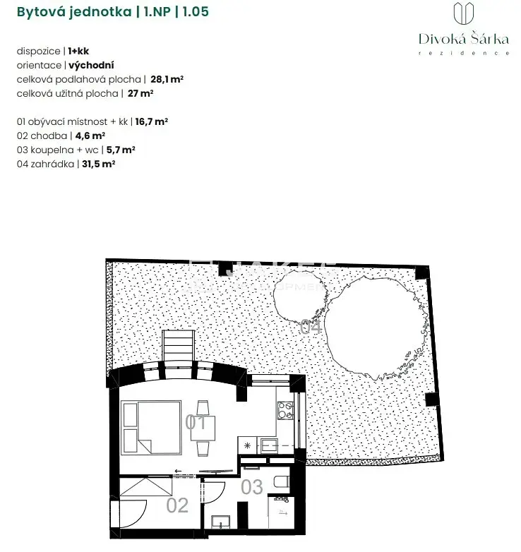 Nabízíme k pronájmu moderní a útulný byt 1+kk o podlahové ploše 28 m², který se nachází na 1. nadzemním podlaží s orientací na východ. K bytu patří předzahrádku o velikosti 32m² Hledáme dlouhodobého nájemníka (nekuřák, bez exekucí).
