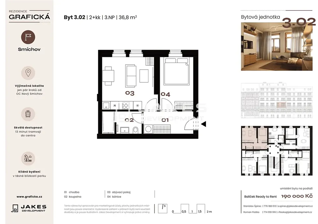 Nabízíme k prodeji byt 2+kk o celkové ploše 36,8 m², umístěný ve třetím nadzemním podlaží developerského projektu Rezidence Grafická. Byt je orientován do klidné jednosměrné ulice, což zajišťuje příjemnou pohodu a dostatek soukromí. Provoz v ulici je minimální, díky čemuž nabízí bydlení tiché a nerušené prostředí. Je ideální volbou jak pro vlastní bydlení, tak pro investici s dlouhodobým potenciálem.