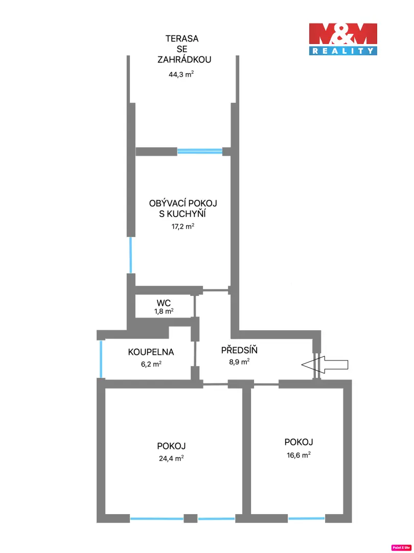 Dominantou bytu je obývací pokoj s kuchyňským koutem a přímým vstupem na terasu. Terasa je krajní, s pěkným otevřeným výhledem a maximálním soukromím – sousedé jsou pouze z jedné strany, což z ní činí ideální místo pro relaxaci i posezení. Dále byt nabízí dva neprůchozí pokoje, velmi prostornou koupelnu a oddělenou toaletu.