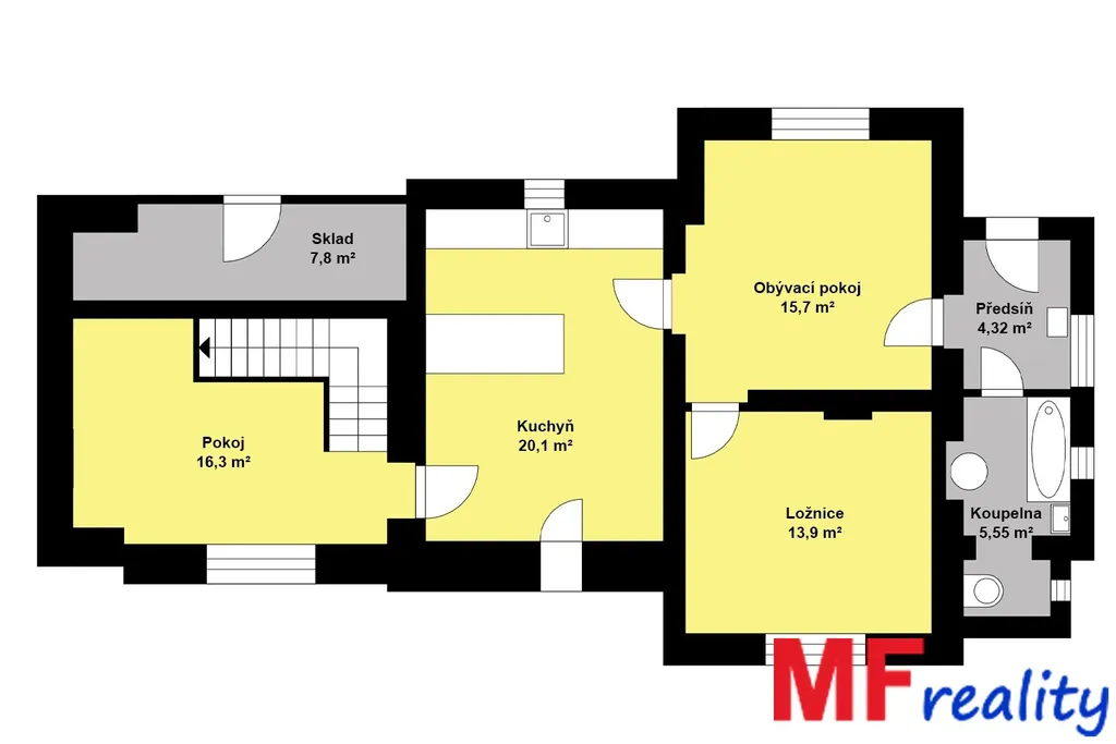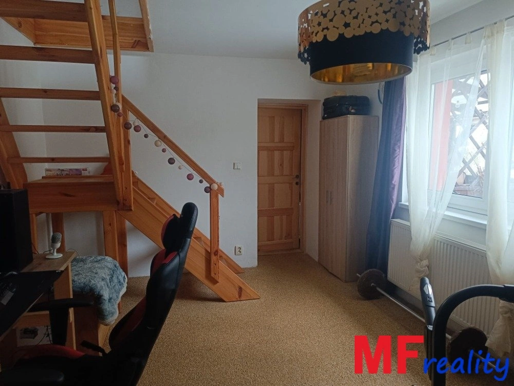 Za kuchyní se nachází dětský pokoj, ze kterého vedou schody do části podkroví - šatny, sloužící pro spaní.