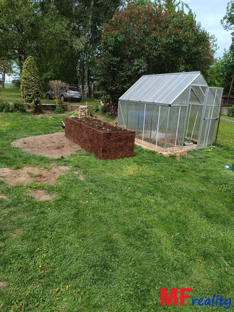 Pozemek je celkově oplocen, mírně svažitý, zahradu tvoří okrasné květiny i dřeviny, pro zeleninu využíván skleník z makrolonu.