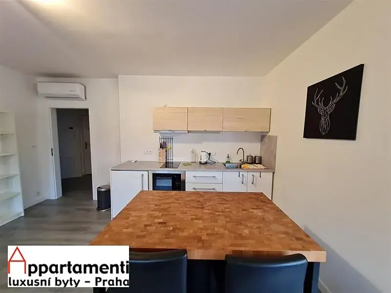 Pronájem podkrovního luxusně zařízeného bytu 2+kk, 73,3m2. Dispozice: předsíň, koupelna se sprchovým koutem a toaletou, další toaleta zvlášť, obývací pokoj s rozkládací sedačkou a kuchyňským koutem, jídelna, ložnice. V bytě je klimatizace.