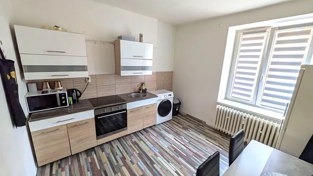 V kuchyni je velice hezká kuchyňská linka, která je vybavena elektrickou troubou, sklokeramickou varnou deskou a nerezovým dřezem .Celá koupelna je obložena vkusnými obklady a vybavena vanou s umyvadlem, WC odděleno. Místnosti jsou světlé, prostorné a moderně zařízené. Po celém bytě jsou plovoucí podlahy. Dům prošel revitalizací fasády.