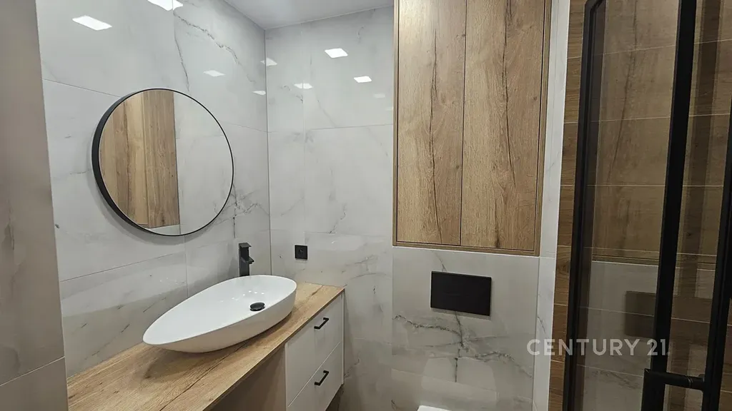 Designová koupelna: sprchový kout, velkoformátové obklady, podsvícené zrcadlo (použitý dekor dřevo a mramor)