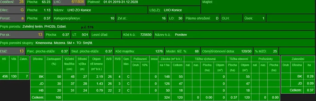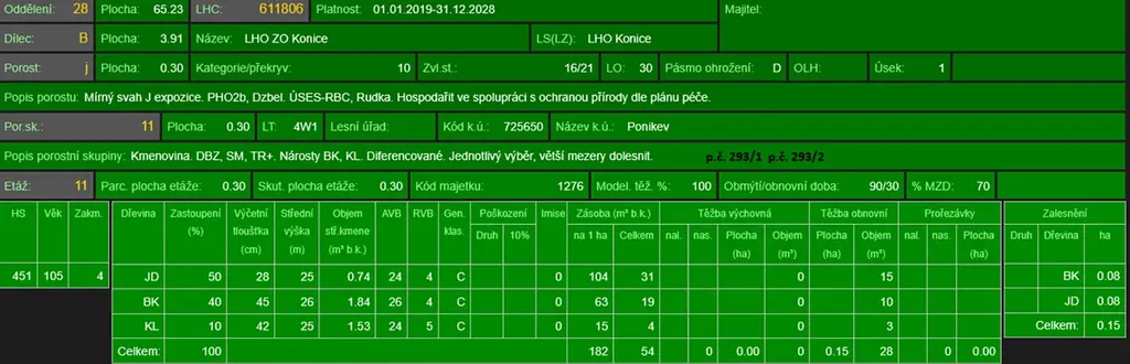 - p.č. 253 vedená jako lesní pozemek o celkové výměře 752 m2 (stáří lesa 127 let - zastoupení dřevin buk),