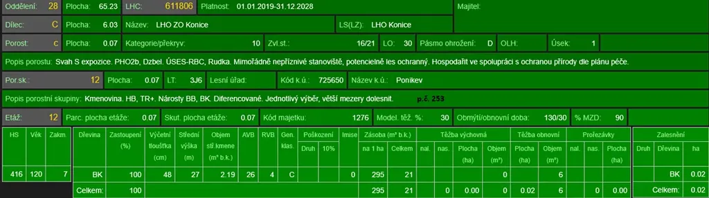 - p.č. 216/2 vedená jako lesní pozemek o celkové výměře 161 m2 (stáří 117 lesa let - zastoupení dřevin buk),