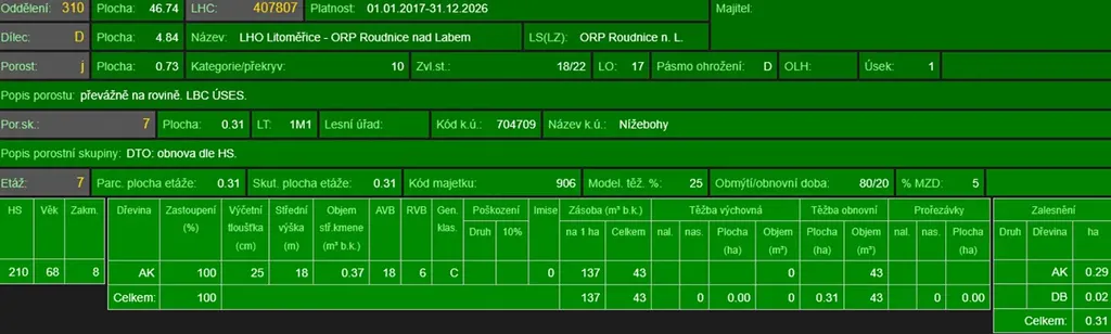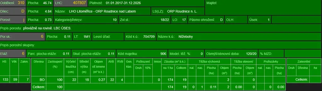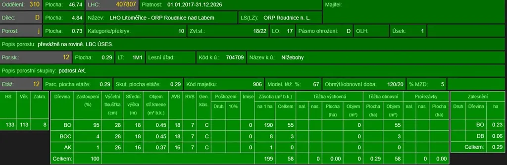 - p.č. 146/1 vedená jako lesní pozemek o celkové výměře 3 763 m2 (stáří lesa 122 let - zastoupení dřevin borovice, borovice černá, akát, stáří lesa 77 let - zastoupení dřevin akát, stáří lesa 68 let - zastoupení dřevin borovice)