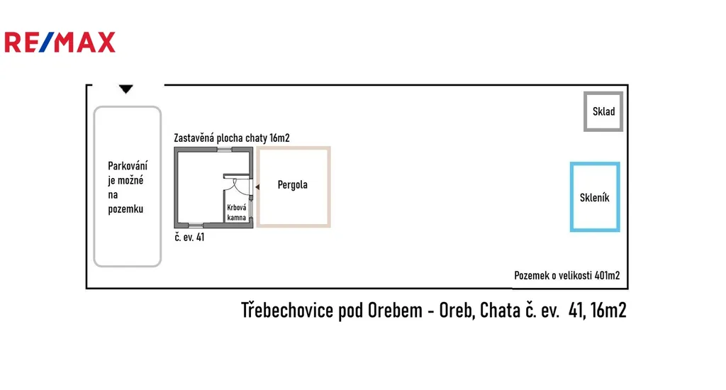 Předmětem prodeje je pouze stavba. Pozemek pod chatou i zahrada jsou ve vlastnictví města Třebechovice pod Orebem a užívány na základě nájemní smlouvy na dobu neurčitou.