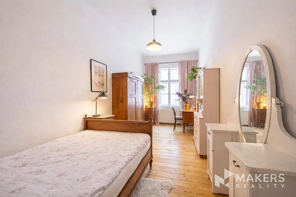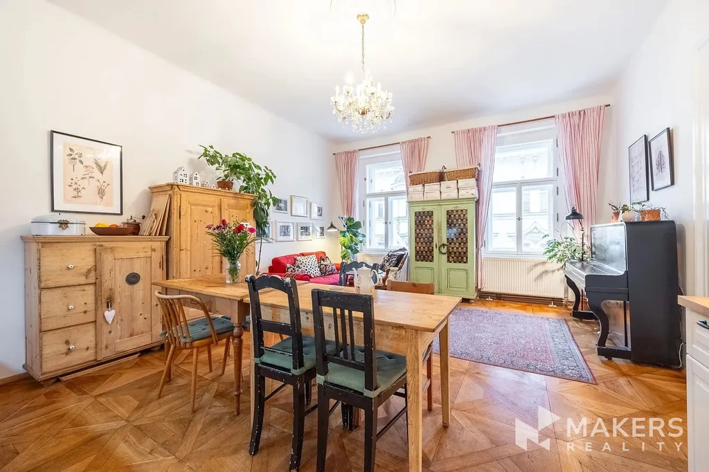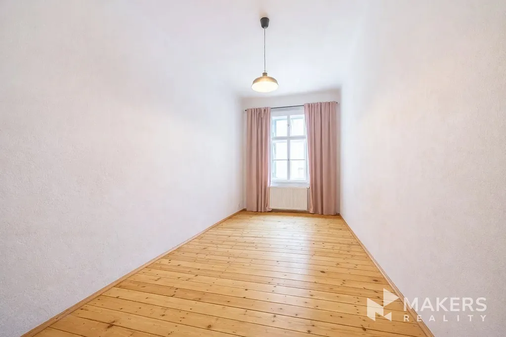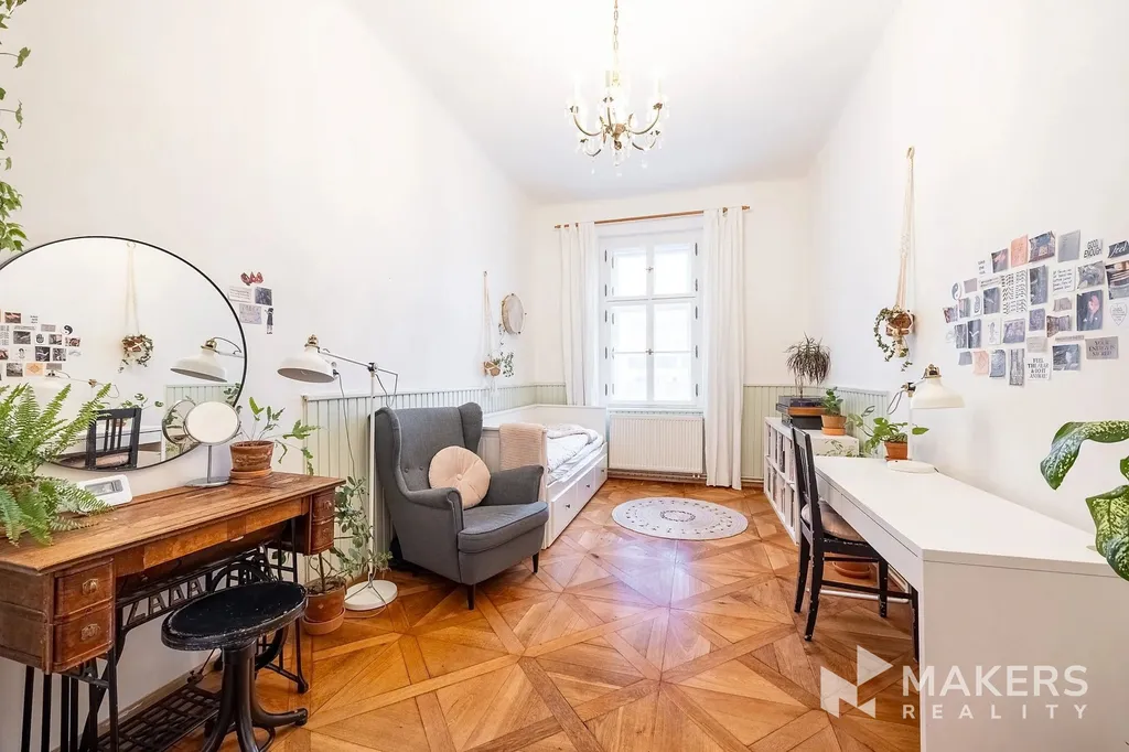 Dispozičně byt nabízí prostorný obývací pokoj s kuchyňským koutem a tři samostatné neprůchozí ložnice, což zajišťuje dostatek soukromí a komfortu pro rodinné bydlení. Díky orientaci na jihovýchod a severozápad je byt velmi dobře prosvětlený a zároveň tichý – obývací část nabízí výhled na historickou zástavbu v památkově chráněné oblasti, zatímco ložnice směřují do klidného vnitrobloku. Interiér si zachoval původní detaily jako vysoké stropy, špaletová okna, dvoukřídlé dveře, mosazné kliky a dubové parkety. Dominantou prostoru jsou funkční krbová kamna, která podtrhují autentickou atmosféru bytu.