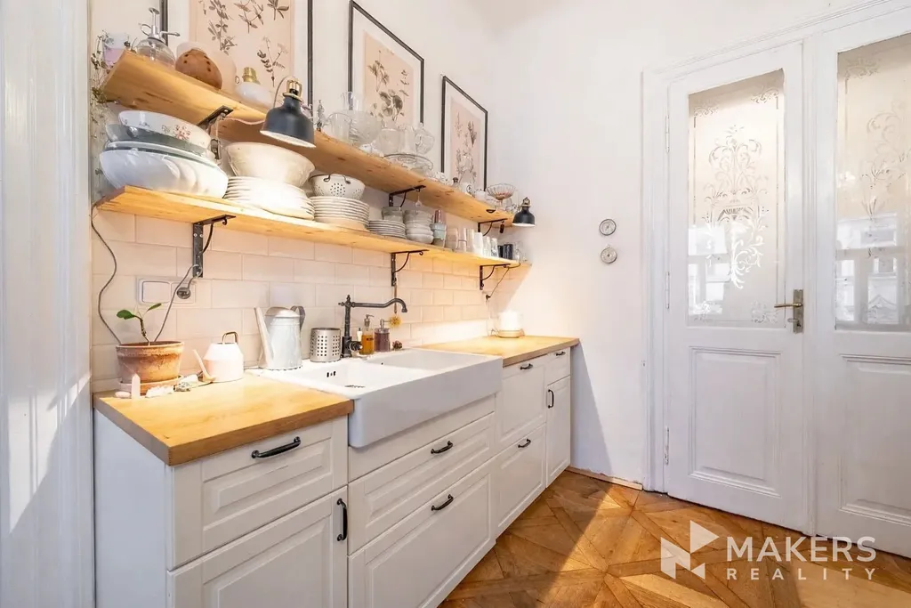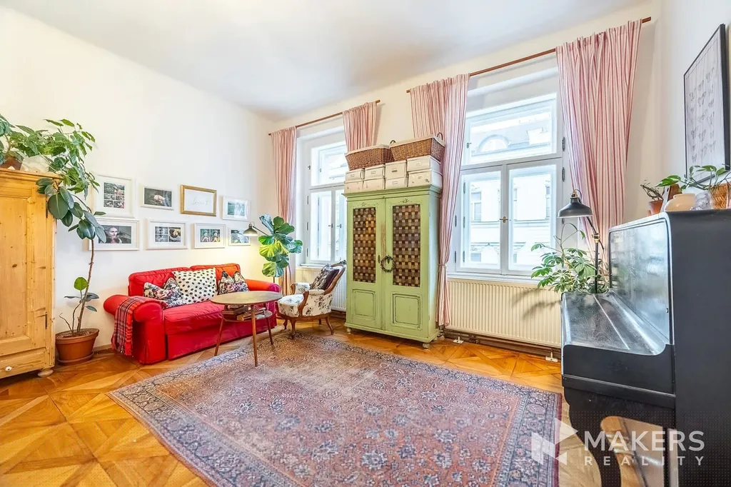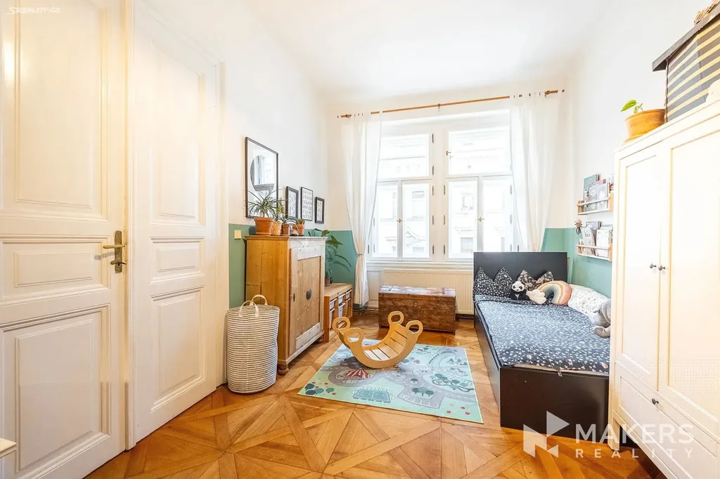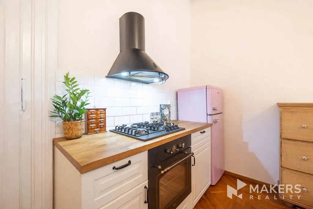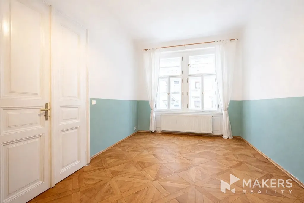 Dispozičně byt nabízí prostorný obývací pokoj s kuchyňským koutem a tři samostatné neprůchozí ložnice, což zajišťuje dostatek soukromí a komfortu pro rodinné bydlení. Díky orientaci na jihovýchod a severozápad je byt velmi dobře prosvětlený a zároveň tichý – obývací část nabízí výhled na historickou zástavbu v památkově chráněné oblasti, zatímco ložnice směřují do klidného vnitrobloku. Interiér si zachoval původní detaily jako vysoké stropy, špaletová okna, dvoukřídlé dveře, mosazné kliky a dubové parkety. Dominantou prostoru jsou funkční krbová kamna, která podtrhují autentickou atmosféru bytu.