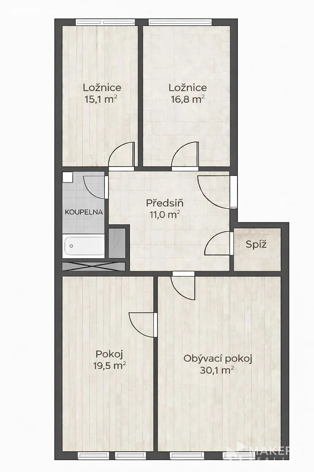 Koupelna a WC jsou oddělené, přičemž koupelna je vybavena vanou a dvěma umyvadly. Součástí bytu je praktická spíž s možností využití jako šatna. K bytu náleží uzamykatelná sklepní kóje a k dispozici je balkón v mezipatře.