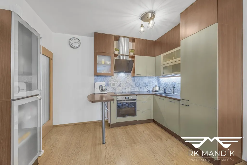 Obývací pokoj spolu s kuchyňským koutem (28,01 m²), který skýtá vestavěné spotřebiče (varná deska, digestoř, myčka nádobí, mikrovlnná trouba, elektrická trouba, kombinovaná lednice s mrazákem), nabízí dostatek prostoru, je vybaven jídelním koutem, pracovním koutem a praktickou vestavnou sklápěcí postelí. Dětský pokoj (12,67 m²) je prakticky řešen, úložný prostor zajišťuje šatní skříň, zbývá dostatek prostoru.
