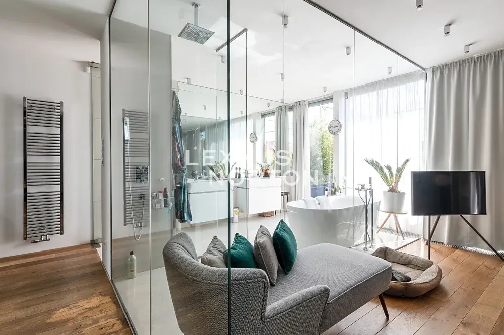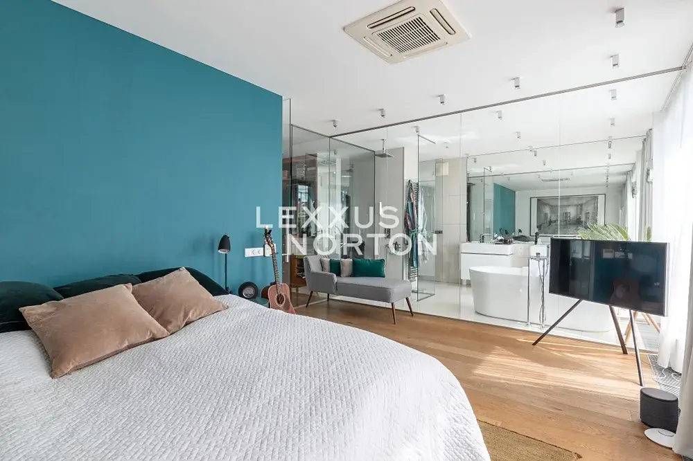 Dominantou bytu je velkorysý obývací pokoj o rozloze 101 m2 s unikátním závěsným krbem a luxusní kuchyňskou linkou vybavenou vestavěnými spotřebiči značky Miele – lednicí s mrazákem, varnou deskou, troubou, mikrovlnnou troubou a myčkou nádobí. Koupelny jsou vybaveny vanou, walk-in sprchou a dvěma umyvadly, u samostatné toalety se nachází i bidet. K nadstandardnímu vybavení bytu dále patří pračka a sušička, vestavěné skříně, kvalitní dřevěné podlahy, bezpečnostní vstupní dveře, alarm s možností napojení na PCO a videotelefon.