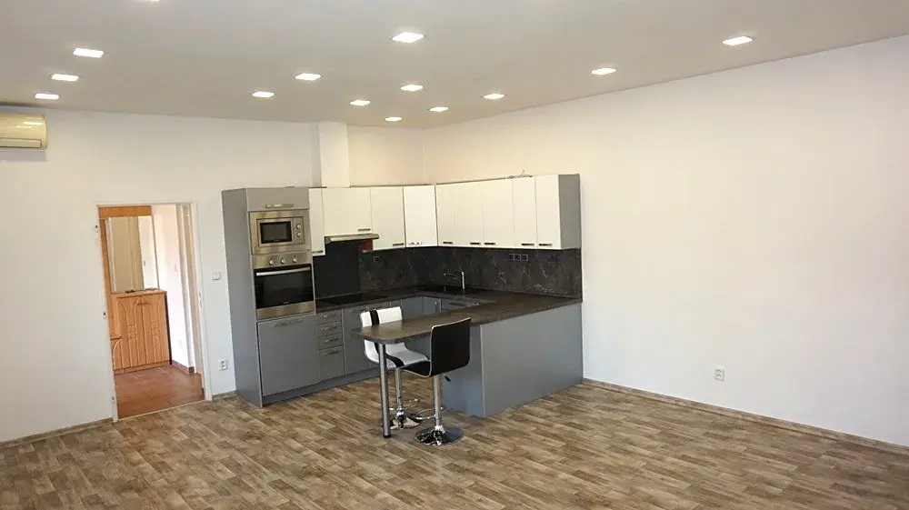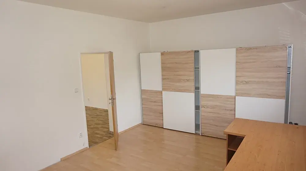 Bytová jednotka se nabízí nezařízená - kuchyňská linka včetně spotřebičů (varná deska, trouba, digestoř), barový jídelní stůl, velké šatní skříně, věšáková stěna v předsíni.