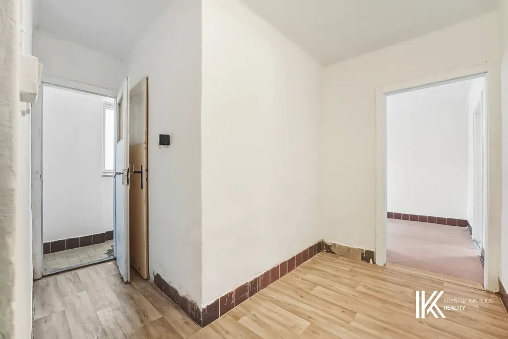 Duši bytu tvoří dva pokoje, které jsou samostatné, ale zároveň vzájemně průchozí, což ponechává budoucímu řešení příjemnou variabilitu. První pokoj je orientovaný na východ a přímo navazuje na kuchyň. Je tak ideálním místem pro obývací prostor – místo, kde se potká denní světlo, rodina i návštěvy. Druhý pokoj směřuje na jih, je zalitý světlem a teplem po většinu dne. Je menší a situovaný dále od kuchyně, vybízí tak k vytvoření tichého útočiště – ložnice s postelí u okna, šatní skříní a čtecím koutkem. Kuchyně je samostatná a orientovaná na sever. Je bez kuchyňské linky, což znamená čistý list papíru – můžete si ji navrhnout přesně podle svého vkusu. Koupelna je společná s toaletou a čeká na kompletní proměnu. Hned vedle koupelny se nachází malá komora, která může sloužit jako praktická spíž, technická místnost nebo místo na pračku a úklidové potřeby. Vše propojuje vstupní prostorná předsíň. Díky své velikosti to není jenom průchozí prostor, ale místo, kde si můžete vytvořit praktické úložné zázemí – velkou šatní skříň s botníkem, věšáky apod. Tento prostor dává bytu příjemný pocit vzdušnosti již od prvního kroku dovnitř.