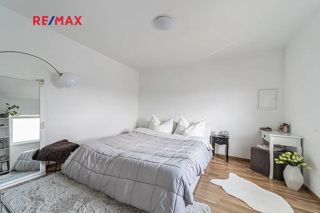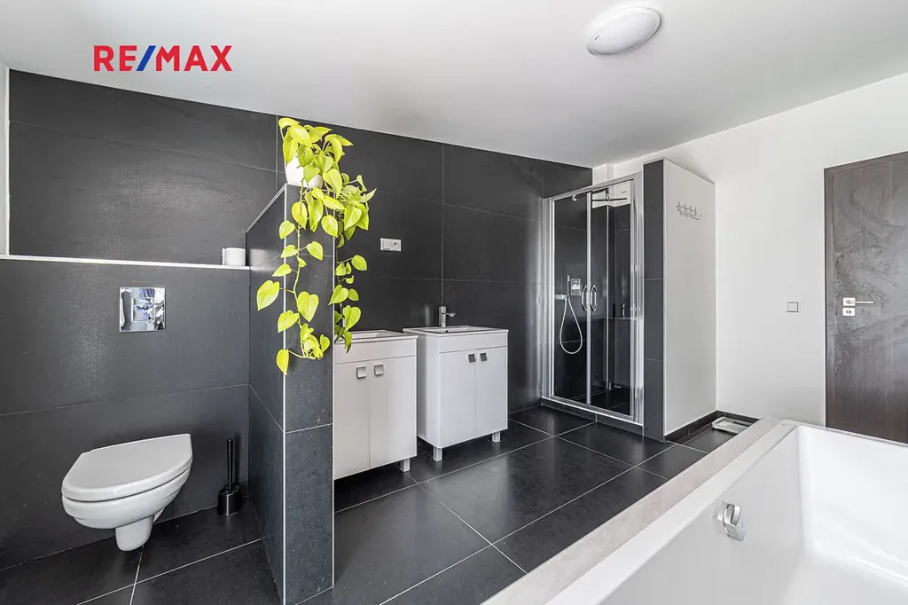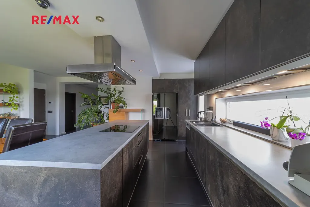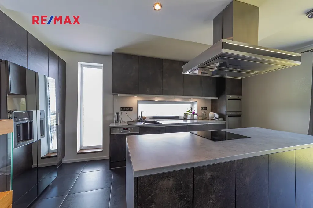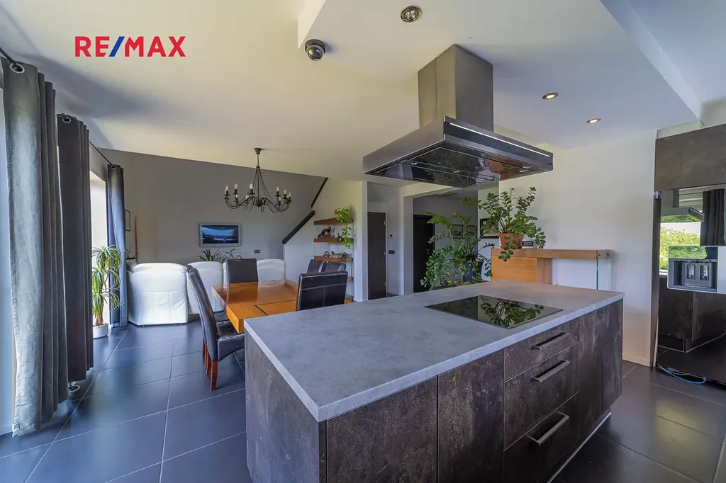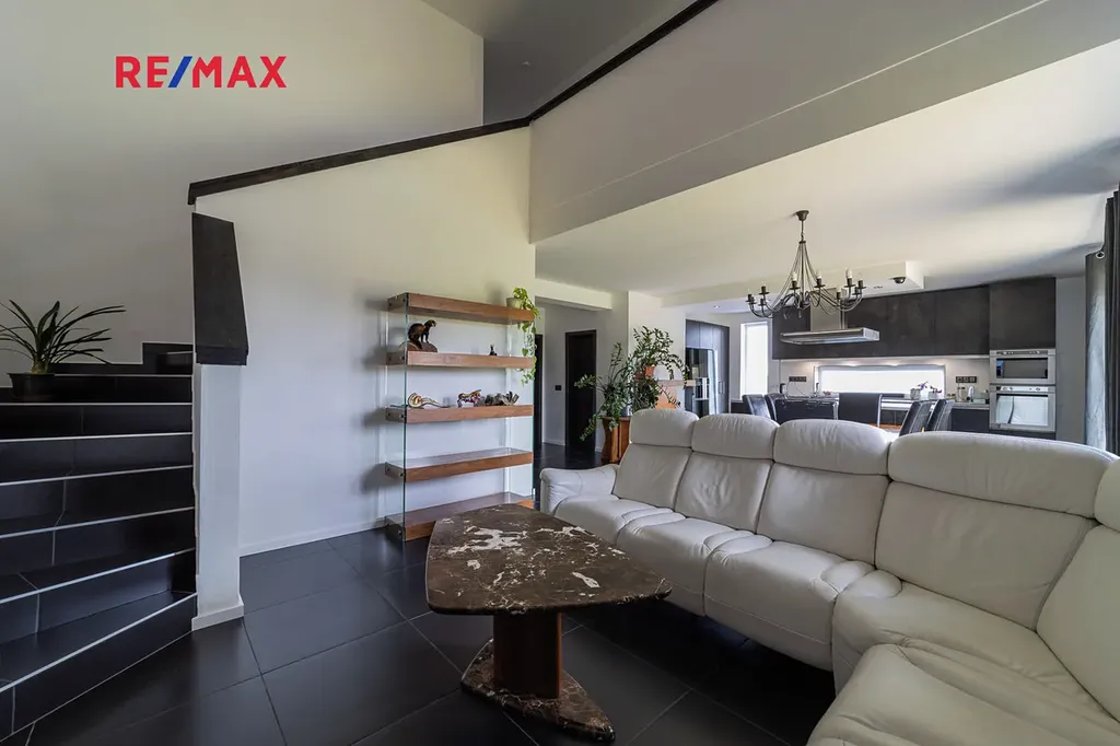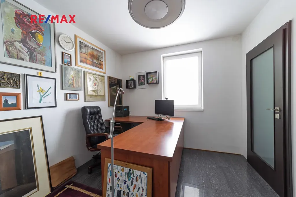 V přízemí domu je samostatná bytová jednotka 1kk včetně koupelny a samostatného wc. Dále je zde prostorná dvougaráž, dílna, sklad na sportovní potřeby a technická místnost, ve které se mimo jiné nachází řídící jednotka fotovoltaické elektrárny umístěné na střeše domu s výkonem 20 kw. Ve druhém a třetím podlaží se nachází opravdu nadstandardně řešený byt 7kk. Při vstupu do tohoto bytu máme hned v prostoru zádveří pracovnu a šatnu, dále se pak otvírá obrovský prostor, který propojuje kuchyň s varným ostrůvkem, jídelnu a obývací pokoj, který je otevřený do galerie do dalšího podlaží. Na tomto patře se dále nachází master bedroom s privátní koupelnou a také samostatná toaleta pro návštěvy. Po vzdušném a světlém schodišti vystoupáme do horního podlaží, kde se nachází soukromá zóna majitelů, kde máme k dispozici krom již zmíněné prostorné koupelny s vanou a sprchovým koutem také další šatnu a 4 pokoje. V tomto podlaží mají téměř všechny pokoje včetně koupelny přes francouzská okna přístup na balkóny, obepínající celou jihozápadní stranu domu.