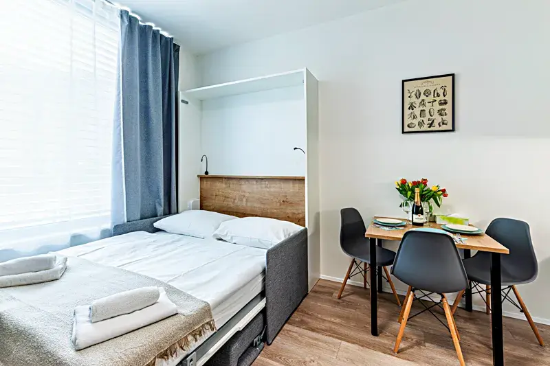 Světlý obytný prostor s moderně integrovaným kuchyňským koutem a místem pro spaní i relaxaci.