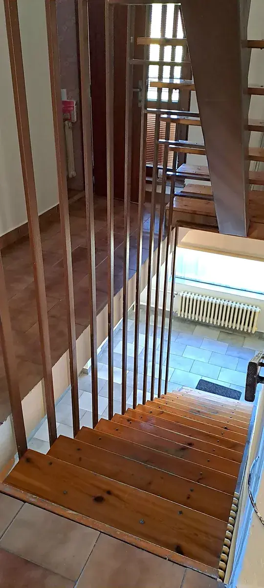 2.NP - ze schodiště je vstup do bytu o velikosti 3+1. Z chodby je vstup na balkon, samostatné wc, do spíže a do kuchyně s jídelnou. V kuchyni je kuchyňská linka s myčkou a elektrickou troubou. Z kuchyně je vstup do pokoje s krbem, odkud je vstup na balkon. Komín je vyvložkovaný a vyčištěný, v komíně je krbová vložka na topení tuhými palivy. Z chodby je vstup do dalších dvou pokojů a do koupelny, která byla zrekonstruovaná před pár lety.