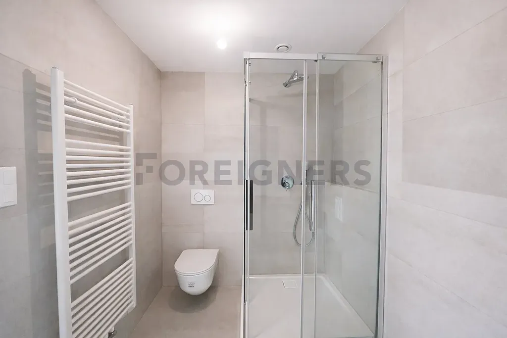 Byt se nachází v 10. – posledním patře, což zajišťuje maximální soukromí, klid a naprosto jedinečný výhled na park i panorama Brna. Z každého pokoje vstup na terasu.