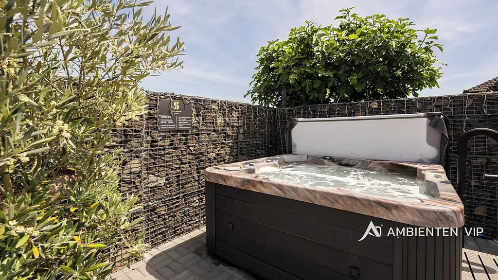 Návštěvníkům apartmánů je k dispozici venkovní kuchyně s grilem a další vířivka. Součástí nemovitosti je bazén o rozměru 6,5 × 4 metry s protiproudem. Celý prostor lze zakódovat pomocí zabezpečovacího systému Jablotron a chráněn je také kamerovým dohledem. V každém detailu je patrné, že nemovitost byla navržena s důrazem na funkčnost a komfort. Parkování pro 3-4 osobní automobily je přímo před pozemkem.