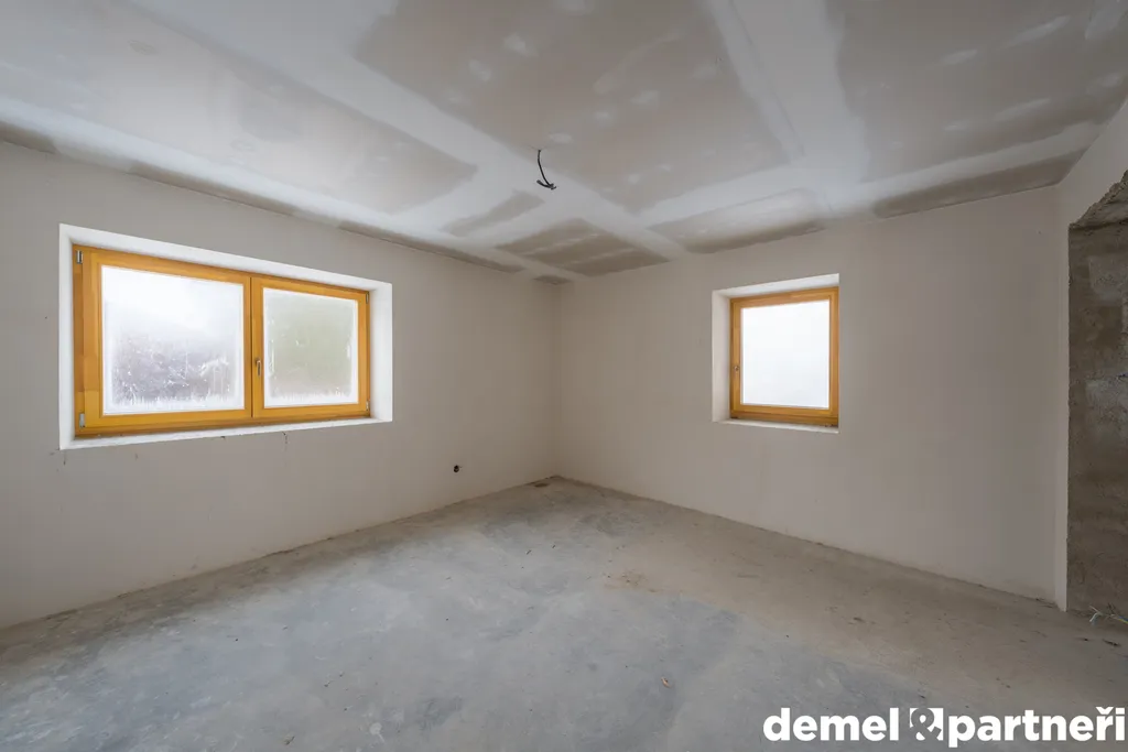 Vstupujeme do prostoru chodby mezi kuchyní a obývacím pokojem, kde dále najdem oddělenou toaletu, koupelnu a místo pro schody do sklepa a do podkroví. Dispozičně bude ideální dům dokončit jako 4+kk, ale může to být klidně i jen 3 kákáčko. Můžeš to ale opravdu předělat podle sebe, protože celkem 160 m² včetně sklepa je opravdu štědrá výměra. Teď jsou v domě dokončené omítky, hrubé rozvody elektra, vody a odpadů. Připravený komín na krbová kamna. Dům se dá vytápět případně i plynovým kotlem. To je už jen a jen na tobě. Z venku jsou osazená nová dřevěná okna. Jinak je to bez zásadních úprav. Ale to jde krásně vidět na fotkách.