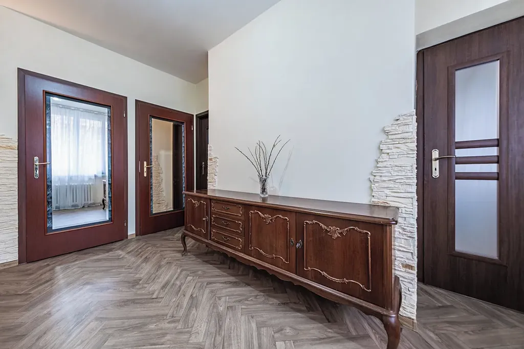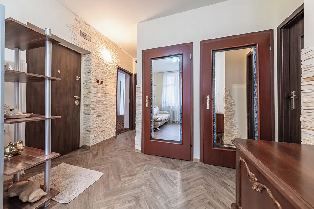 Dispozice bytu je velmi praktická, vstupní hala se dvěma komorami, tři samostatné pokoje s vestavěnými skříněmi na míru, nová kuchyně, samostatné WC, koupelna s vanou a další komora na potraviny.