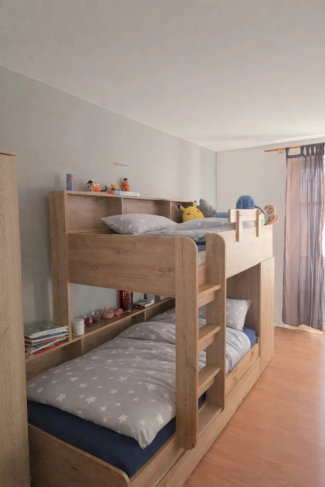 Byt je vybaven kuchyňskou linkou (bez pračky, myčky a lednice - dosavadního nájemníka), dále vestavěnými skříněmi v bytě, postel v dětském pokoji je nájemníka.