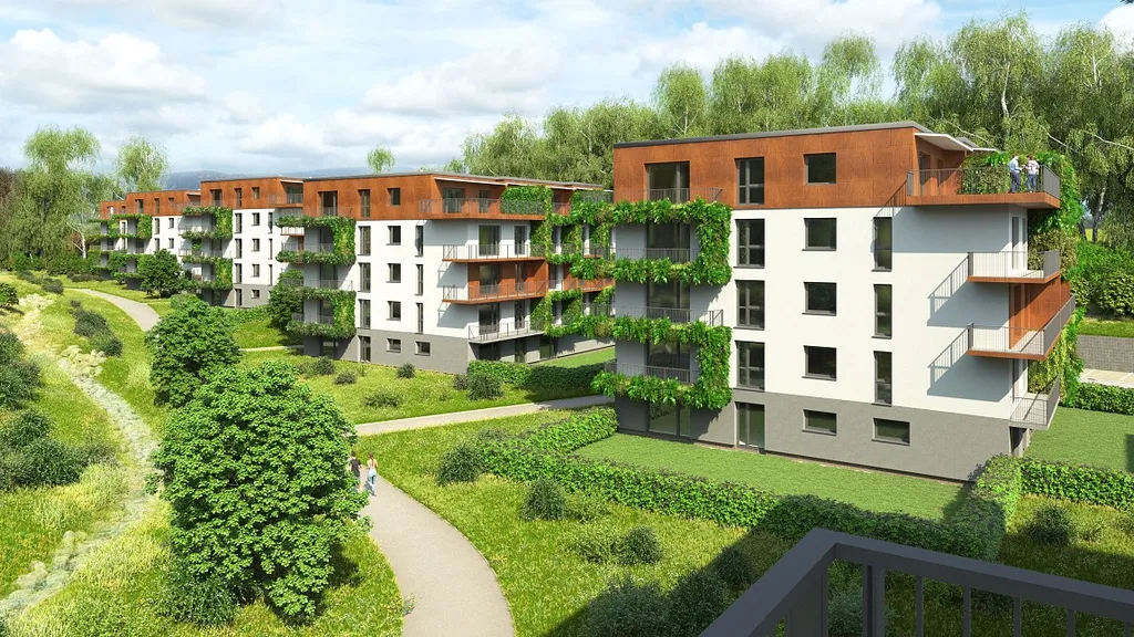 Dlouhodobý pronájem zcela nového bytu 3+kk (69 m²) s velikým rohovým balkonem ve 3. nadzemním podlaží bytového domu B6 – kolaudace proběhne v tomto měsíci. Samostatná garáž velikosti 17 m² se vstupem přímo k výtahu zahrnuta v ceně nájmu. Praktická rodinná dispozice - obývací pokoj (30 m²) s moderní kuchyňskou linkou v bílo-šedém designu, dvě neprůchozí ložnice (10 a 15 m²), koupelna s vanou, WC zcela odděleno, vstupní hala 8 m². K dispozici je bezpečná a prostorná sklepní koje nadstandardní velikosti 7,83 m² včetně garáže pro 1 osobní auto přímo v domě. Součástí výstavby bude dokonalá parková úprava rezidenčního bytového komplexu – nově přiznaný tok potoka s lávkami, malý biotop, vybudovaná cyklostezka, bike park, gril pointy, dětské hřiště s prvky venkovní posilovny.