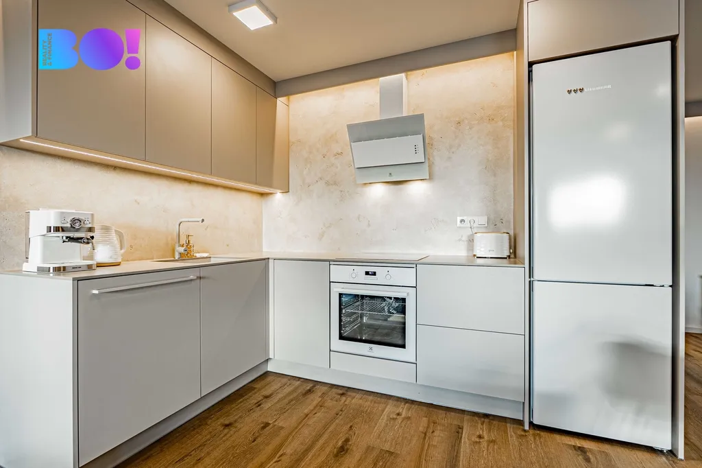 Kuchyně na míru včetně moderních spotřebičů: lednice s mrazákem, mikrovlnná trouba, elektrická trouba, varná deska, myčka nádobí a digestoř.