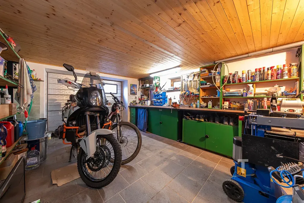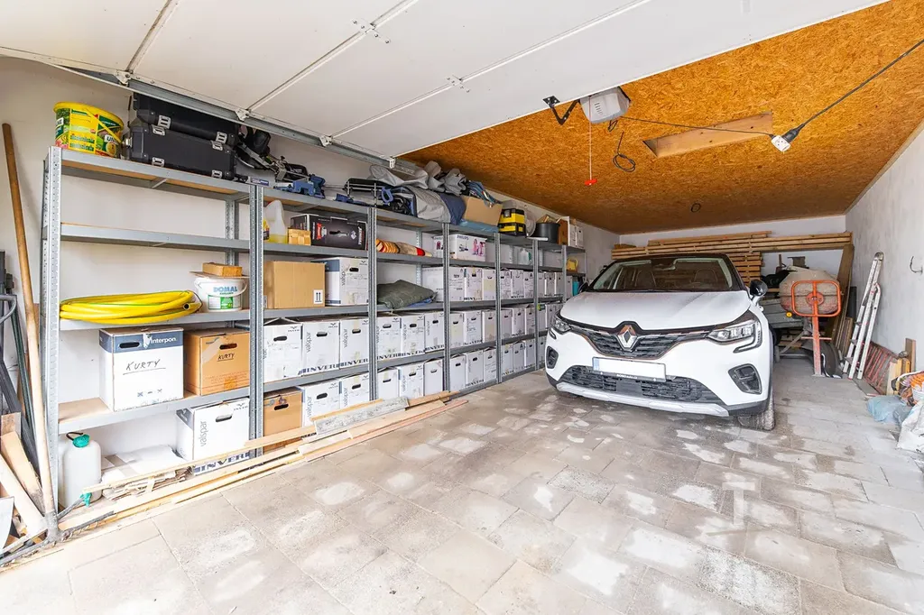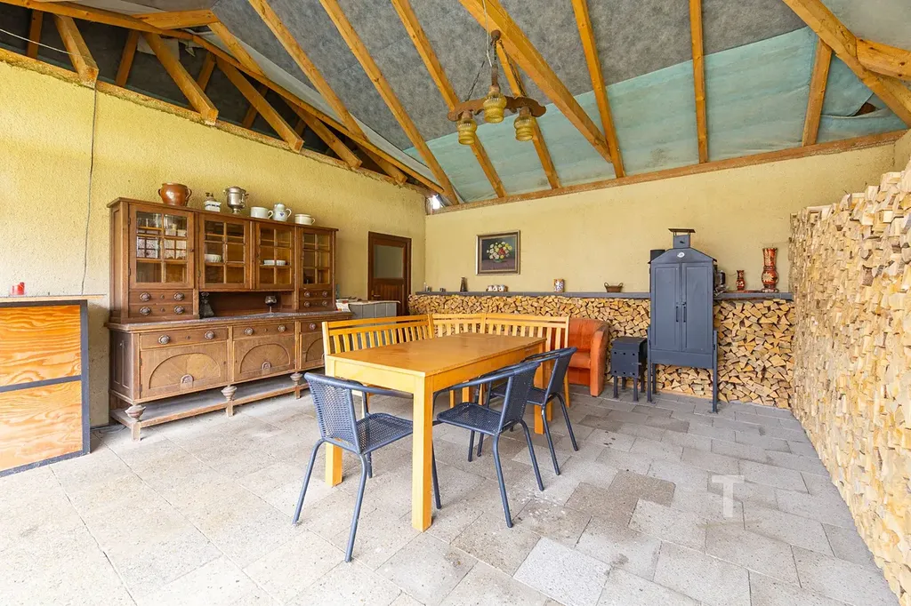 Za domem se nachází samostatná dvougaráž s krytým posezením, která výrazně rozšiřuje možnosti využití celé nemovitosti. Tento prostor nabízí potenciál pro vybudování navazujícího pokoje, samostatné bytové jednotky pro vícegenerační bydlení, případně další rozšíření garážových prostor nebo kombinaci bydlení a podnikání.
