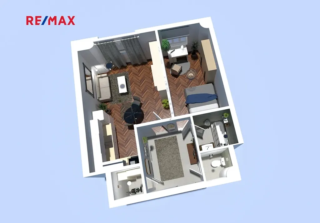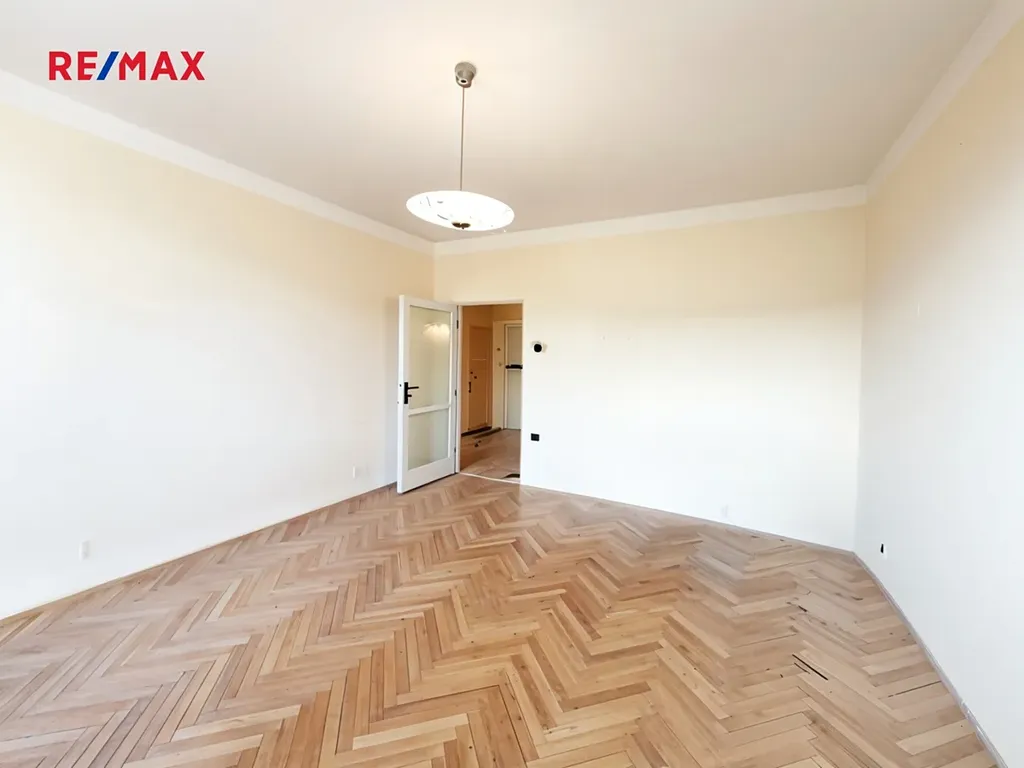 Prostor má praktickou dispozici: prostorná vstupní chodba, dva samostatné pokoje, kuchyně, úložná komora, koupelna a samostatná toaleta. K bytu náleží balkon a dvě sklepní kóje. Byt je kompletně vyklizený a připravený k rekonstrukci. Inzerát zobrazuje současný stav bytu i vizualizaci možné rekonstrukce pro lepší představu o budoucím potenciálu. Balkon a okna jsou orientována na jihozápad do klidné ulice.