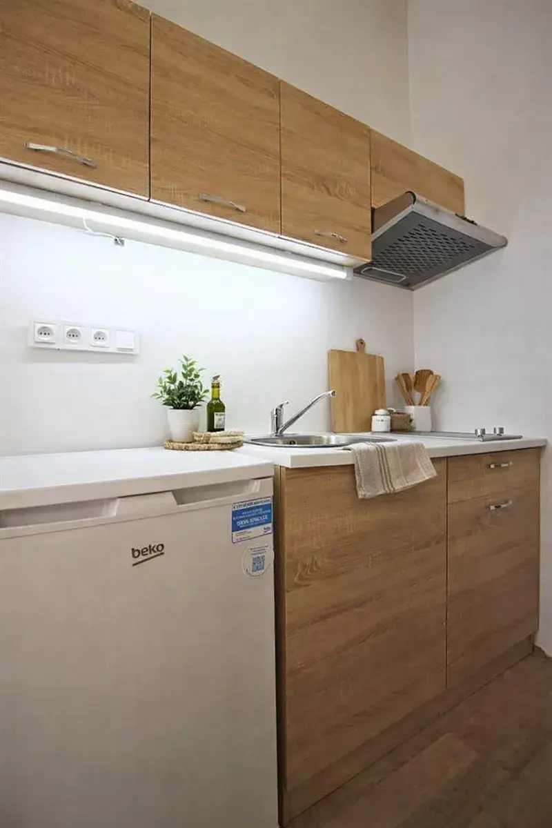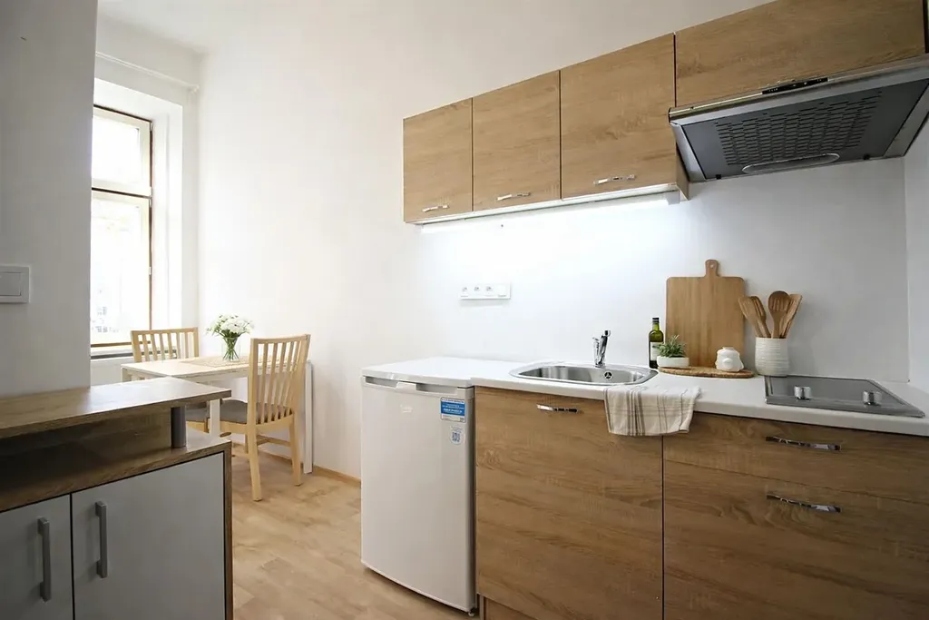Byt je plně zařízený; kuchyňský kout je vybavený spotřebiči varná deska, digestoř, lednička a jídelní stůl se židlemi.