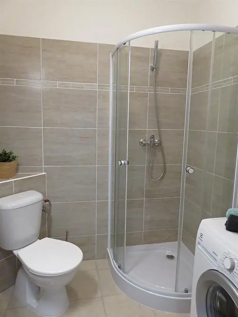 V koupelně je sprchový kout s umyvadlem, toaletou a pračkou.