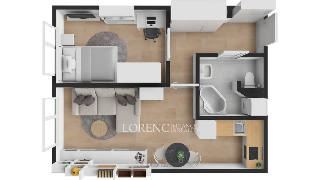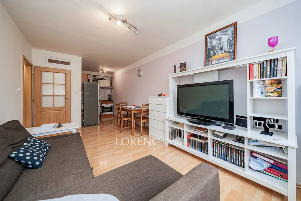 Dominantou bytu je světlý obývací pokoj s kuchyňským koutem o velikosti 19,8 m², orientovaný tak, aby poskytoval dostatek denního světla. Naproti vstupu do bytu se nachází samostatný pokoj o velikosti 10,8 m², ideální jako ložnice nebo dětský pokoj.