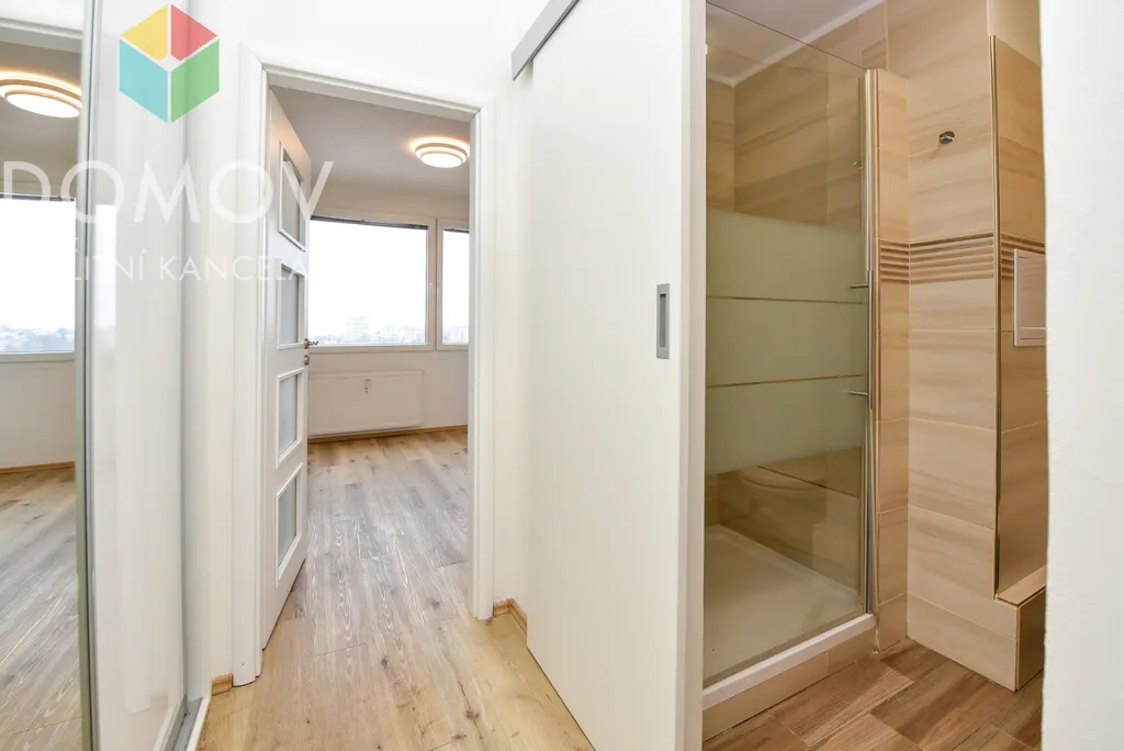 Dominantou bytu je obývací pokoj, který je elegantně rozdělen polopříčkou na obytnou a spací část. Vzniká tak oddělený prostor pro postel a soukromí, aniž by došlo ke zmenšení hlavní místnosti. Kuchyně je vybavena moderní linkou se spotřebiči – indukční varnou deskou, elektrickou troubou, mikrovlnnou troubou a digestoří s odtahem mimo byt. Koupelna nabízí sprchový kout a je řešena prakticky a úsporně. V bytě jsou plovoucí podlahy, vytápění je dálkové. K jednotce náleží také sklepní kóje, která poskytuje další úložný prostor.