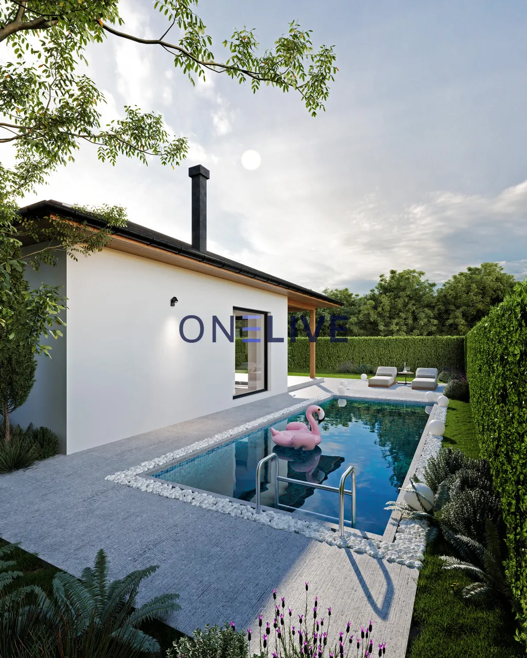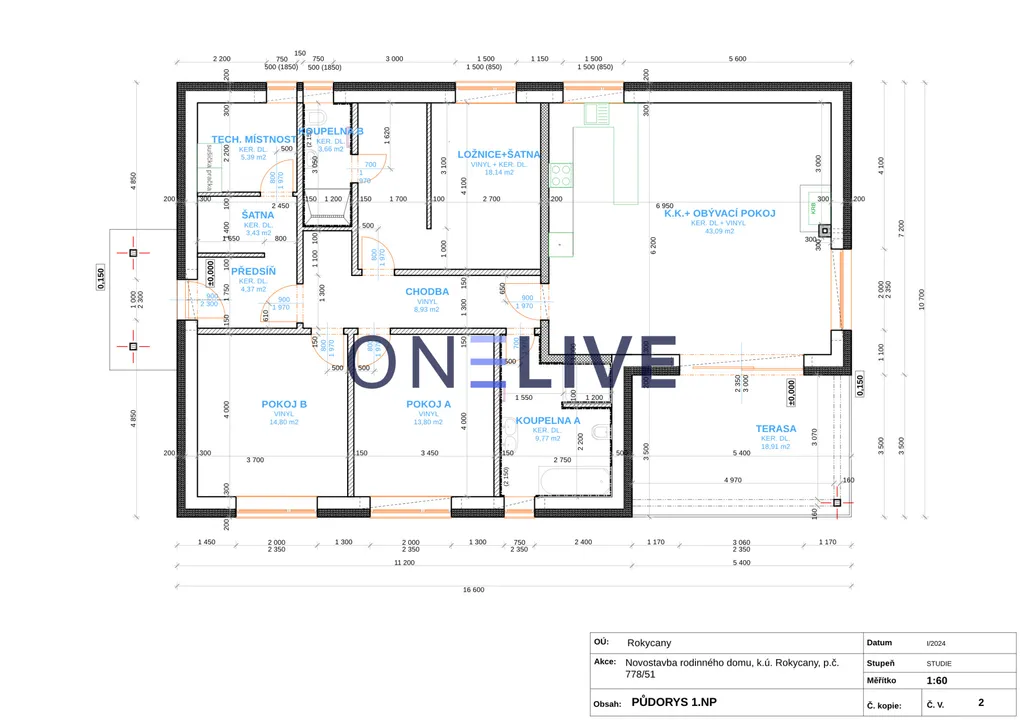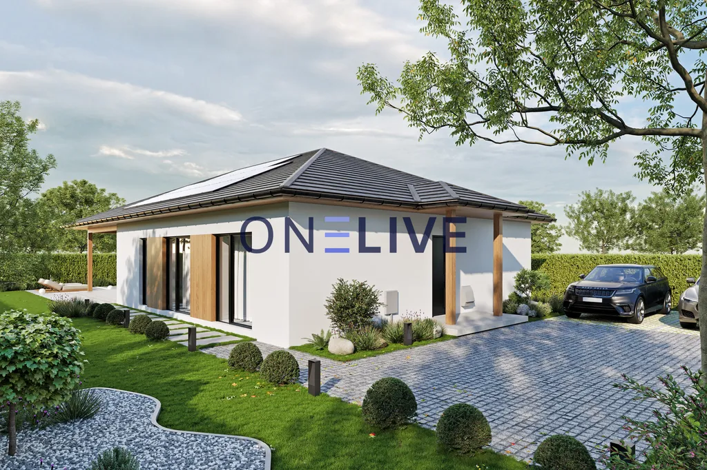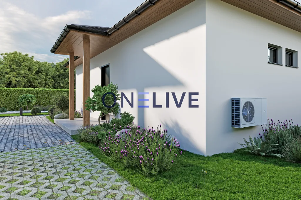 Dominantou domu je prostorný obývací pokoj s kuchyňským koutem a krbem, který se otevírá na zastřešenou terasu, ideální pro rodinné oslavy nebo relaxaci. Díky velkým oknům až k zemi je prostor prosvětlený a působí velice příjemně. Dům je navržen jako nízkoenergetický, s kvalitními materiály – zdivo Ytong (30 cm), zateplení polystyrenem (20 cm), izolační plastová okna s trojsklem a zateplená střecha s izolační vatou. Vytápění zajišťuje teplovodní podlahový systém s tepelným čerpadlem, a pro maximální komfort je připravena instalace klimatizace v každém pokoji. Všechna okna jsou vybavena venkovními žaluziemi pro stínění i bezpečnost.